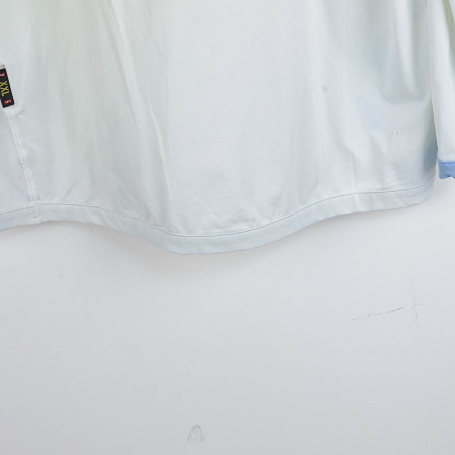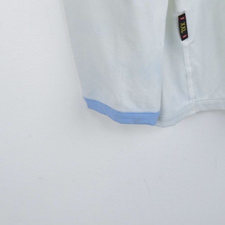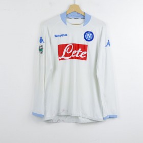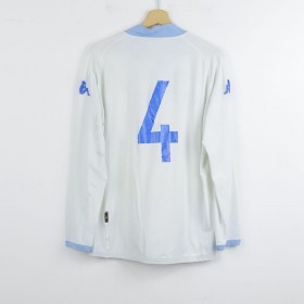 Maglia ufficiale da trasferta del Napoli per la stagione 2005/2006, prodotta dallo sponsor tecnico Kappa. Questo modello, di colore bianco con dettagli celesti su colletto e maniche, è personalizzato con il numero 4 sul retro. Sul petto troviamo lo stemma del club cucito e il logo Kappa ricamato, mentre lo sponsor commerciale "Lete" è stampato in rosso al centro. La manica destra è impreziosita dal patch "Lega Calcio Primavera TIM". La maglia è a maniche lunghe e disponibile nella taglia XXL, un pezzo unico per i collezionisti.