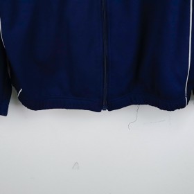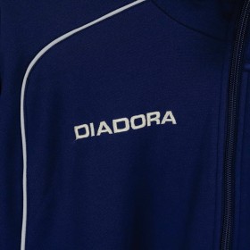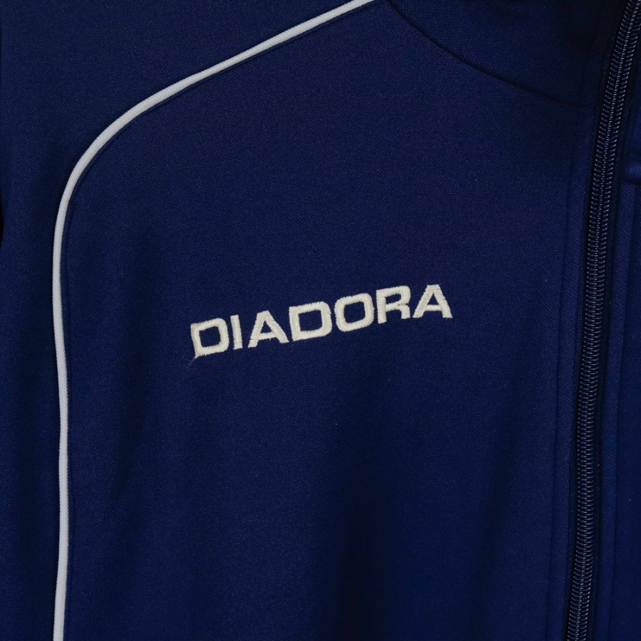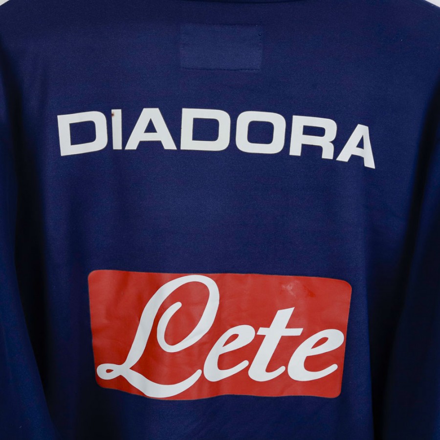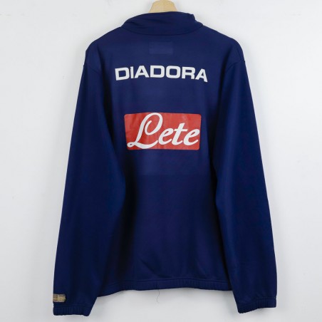 Felpa ufficiale del Napoli, stagione 2009/2010, realizzata dallo sponsor tecnico Diadora. Di colore blu navy, la felpa presenta il logo Diadora sul petto a destra e lo stemma del Napoli sul lato cuore, entrambi ricamati in bianco. Lo sponsor commerciale "Lete" è ben visibile sia sul davanti che sul retro, stampato in rosso con scritta bianca. La chiusura è a zip integrale, e la taglia indicata è XL. Questo capo, perfetto per il tempo libero, combina funzionalità e stile, rendendolo ideale per i tifosi della squadra partenopea.