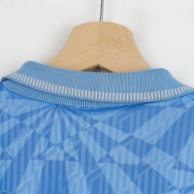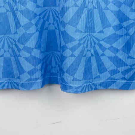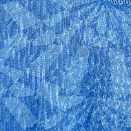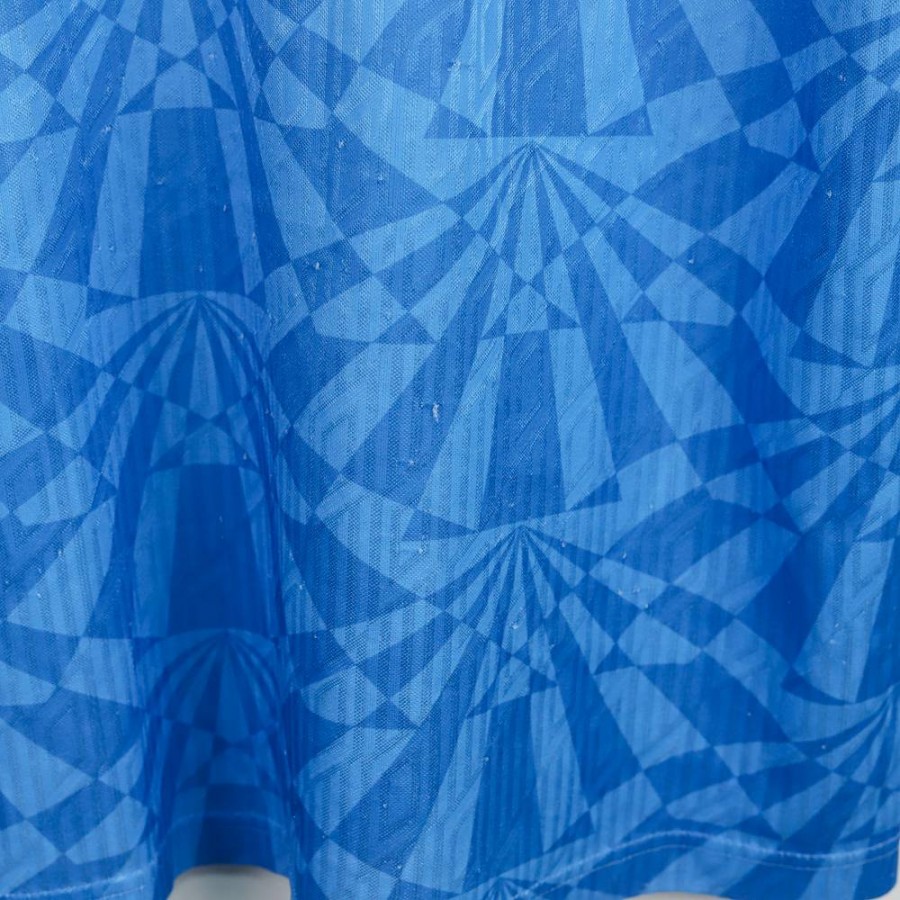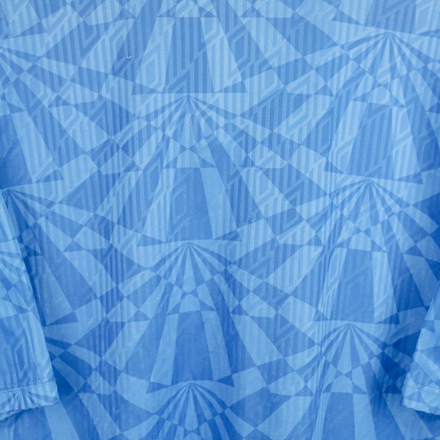 Maglia home ufficiale del Napoli per la stagione 1991/1992, prodotta dallo sponsor tecnico Umbro. La divisa presenta il tradizionale colore azzurro con una fantasia geometrica tono su tono che caratterizza l'intero tessuto. Il colletto a polo è rifinito in bianco e azzurro con chiusura a bottone. Sul petto, il logo Umbro è applicato sul lato destro, mentre lo stemma del Napoli è applicato sul lato sinistro. Al centro è presente lo sponsor commerciale Voiello, applicato in bianco con una lettera mancante.