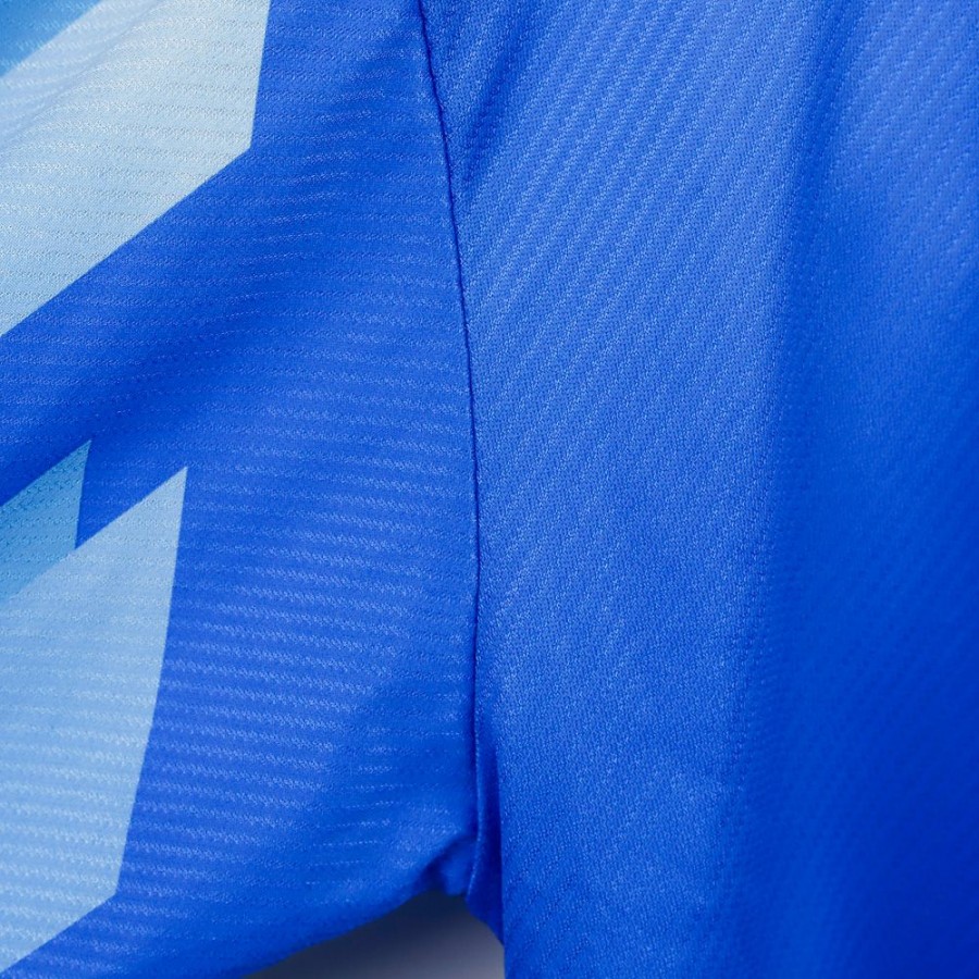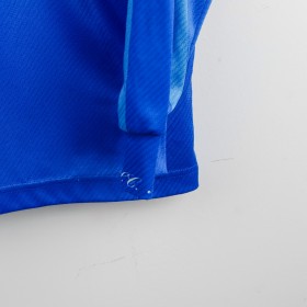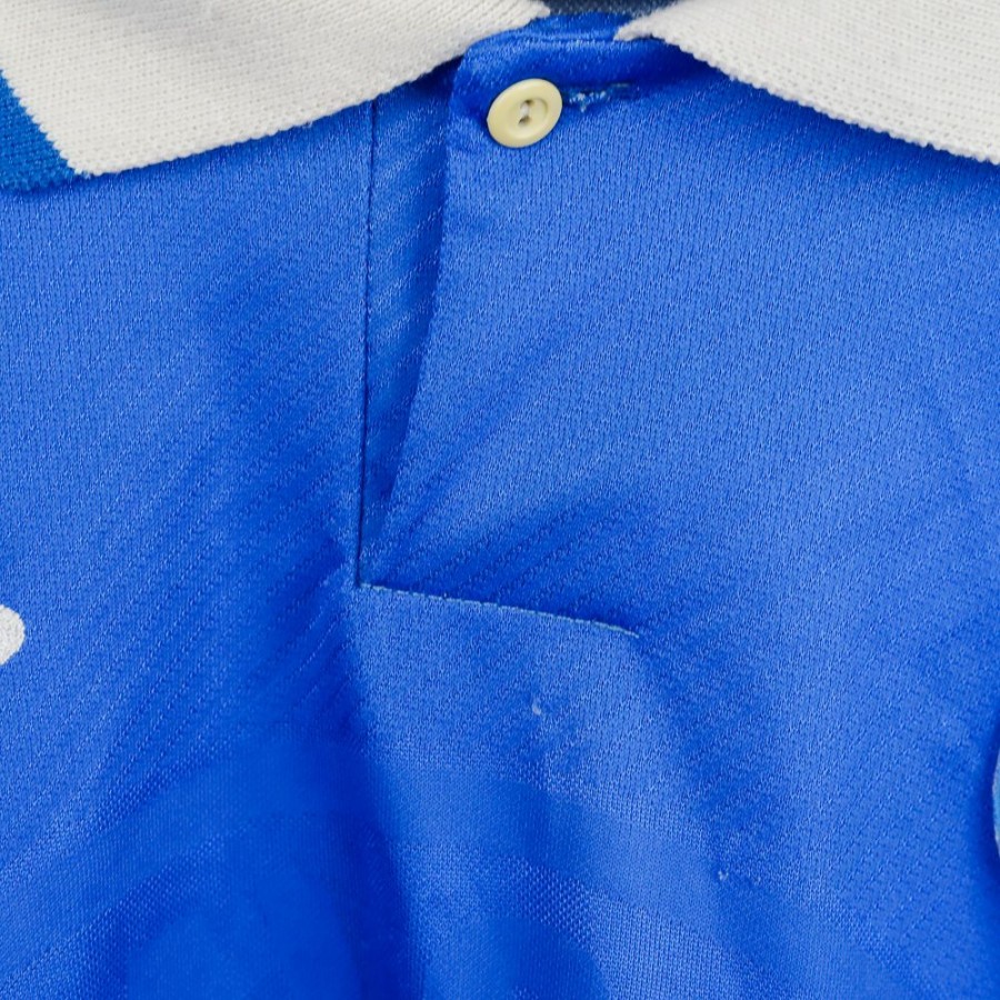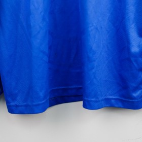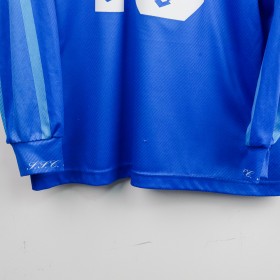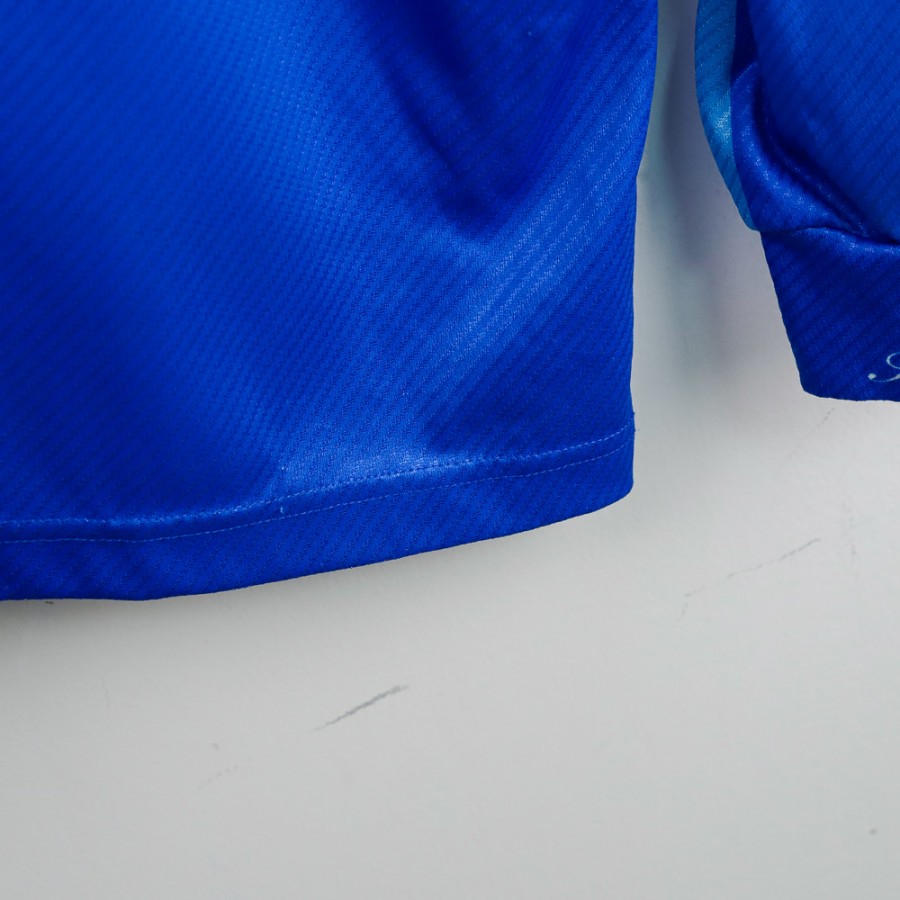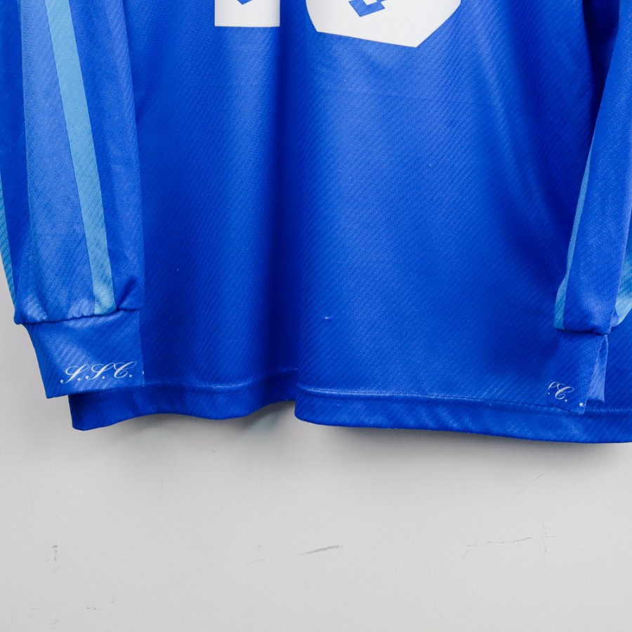 Maglia home del Napoli della stagione 1996/1997 a maniche lunghe, prodotta da Lotto. Il design azzurro presenta una grafica geometrica centrale con motivi diamantati in blu e bianco. Il colletto bianco con bordo blu conferisce un tocco retrò, mentre sulle maniche sono presenti dettagli tono su tono con le iconiche losanghe Lotto. Lo sponsor tecnico Lotto è ben visibile sul petto, insieme allo sponsor commerciale Centrale Latte di Napoli. Taglia 50.