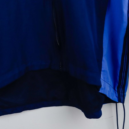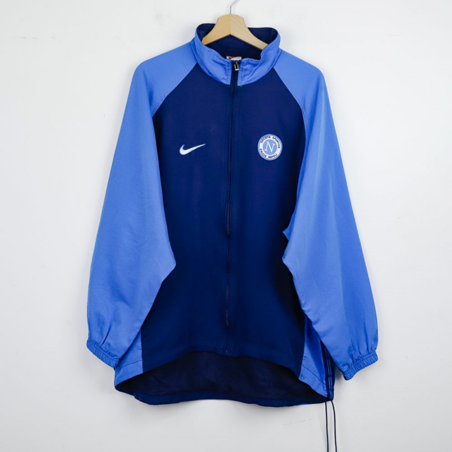 Giubbino ufficiale del SSC Napoli per la stagione 1998/1999 realizzato da Nike. Il modello è caratterizzato da un design a due tonalità di azzurro con zip centrale e coulisse regolabile in vita. Sul petto compaiono il logo Nike come sponsor tecnico e lo stemma classico della SSC Napoli, mentre sul retro si trova la scritta “NAPOLI” sotto al colletto e il celebre Swoosh bianco in grande formato. Taglia M.