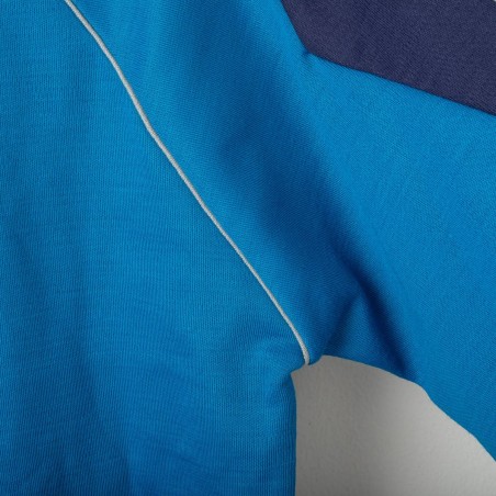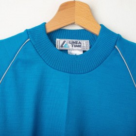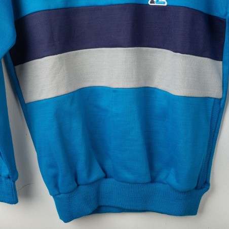 Felpa Linea Time 1984/1985, taglia 46 (corrispondente a una S/M), realizzata in Italia dal marchio Linea Time. Presenta una combinazione di colori tipica dell'estetica anni '80, con bande blu navy e grigio chiaro che attraversano il corpo centrale su base azzurra. Il logo Linea Time è applicato sul petto, mentre il design con cuciture a contrasto evidenzia le linee delle maniche.