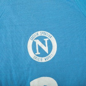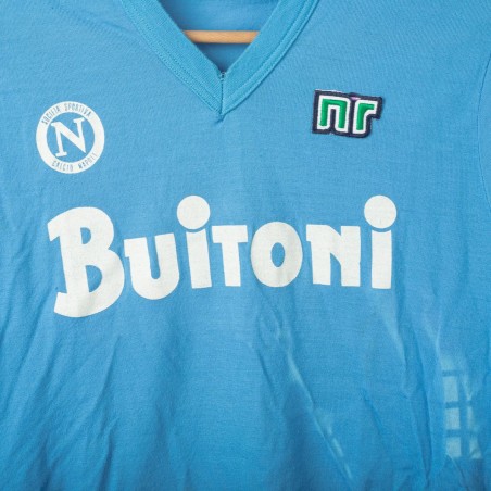 Maglia Home Napoli Ennerre 1985/1986, taglia non specificata. Realizzata dallo storico sponsor tecnico Ennerre, la maglia presenta il logo NR sul petto accanto allo stemma del Napoli e lo sponsor commerciale Buitoni ben visibile al centro. Il design a maniche corte con colletto aperto a V è uno dei più iconici degli anni '80.