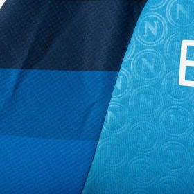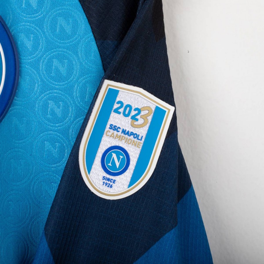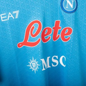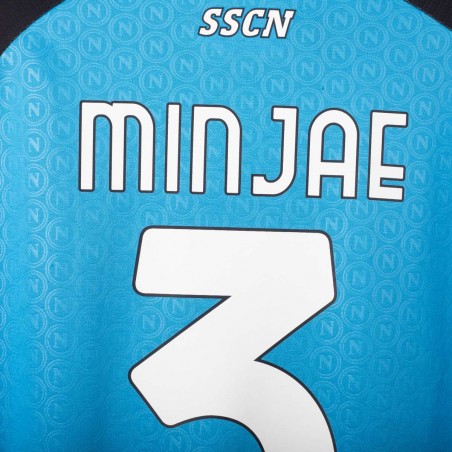 Maglia Home Napoli stagione 2022/2023 con nome e numero del difensore coreano Kim Minjae, 3. La divisa, realizzata da EA7, presenta gli sponsor tecnici EA7 e commerciali Lete, MSC e Amazon. Sul fianco destro è applicata la patch celebrativa "SSC Napoli Campione 2023", utilizzata nel corso della partita contro la Sampdoria. Taglia XL. Kim Minjae è stato uno dei protagonisti della storica cavalcata che ha portato il Napoli alla conquista del suo terzo scudetto, dimostrando grande solidità difensiva e carisma al primo anno in Serie A.