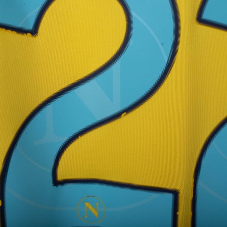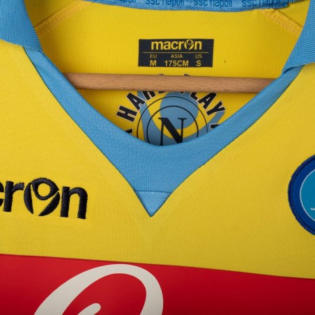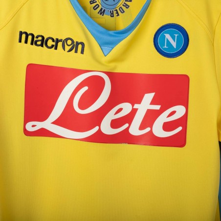Maglia third ufficiale del Napoli per la stagione 2011/2012, realizzata da Macron. La casacca è caratterizzata da una vivace combinazione di giallo e azzurro, con inserti neri sulle spalle e dettagli blu su colletto e maniche. Sul petto campeggiano il logo Macron, lo stemma SSC Napoli e lo sponsor Lete in rosso. Sul retro, la personalizzazione “Lavezzi 22” un pochino danneggiata. L'interno collo presenta il motto “Work Hard. Play Harder”. Taglia M (EU), condizioni eccellenti.