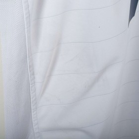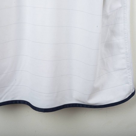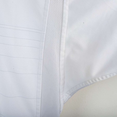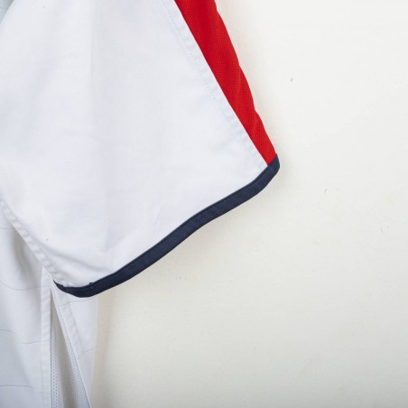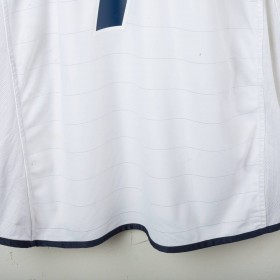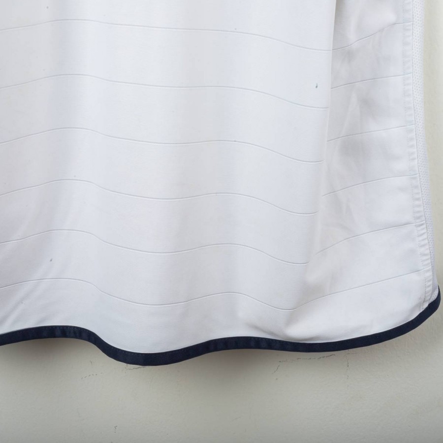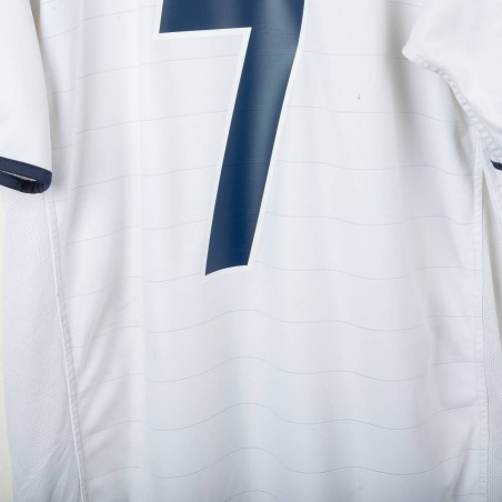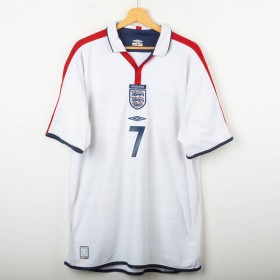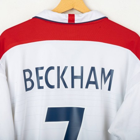 Maglia home dell'Inghilterra utilizzata nella stagione 2004, prodotta da Umbro. Classica colorazione bianca con inserti rossi sulle spalle e dettagli blu su colletto e maniche. Logo Umbro ricamato sul petto, stemma della nazionale inglese cucito lato cuore. Numero 7 e nome Beckham applicati sul retro. Vestibilità regolare. Taglia L.