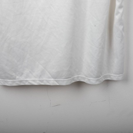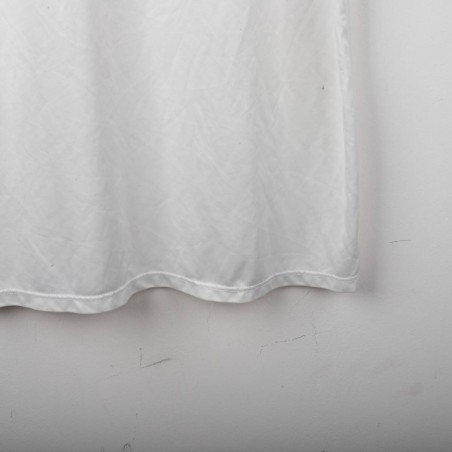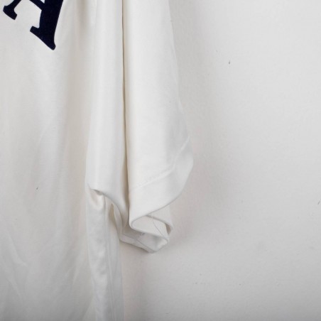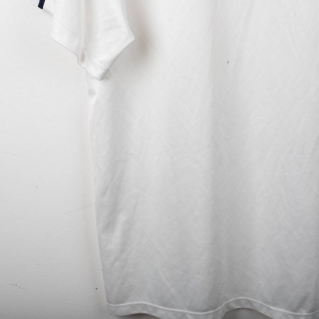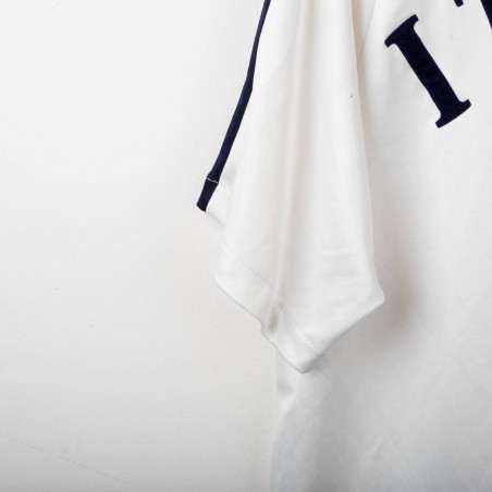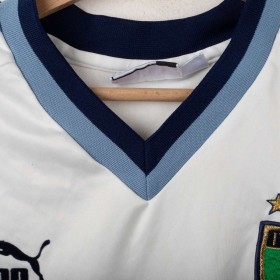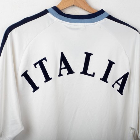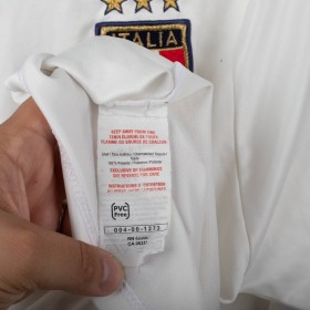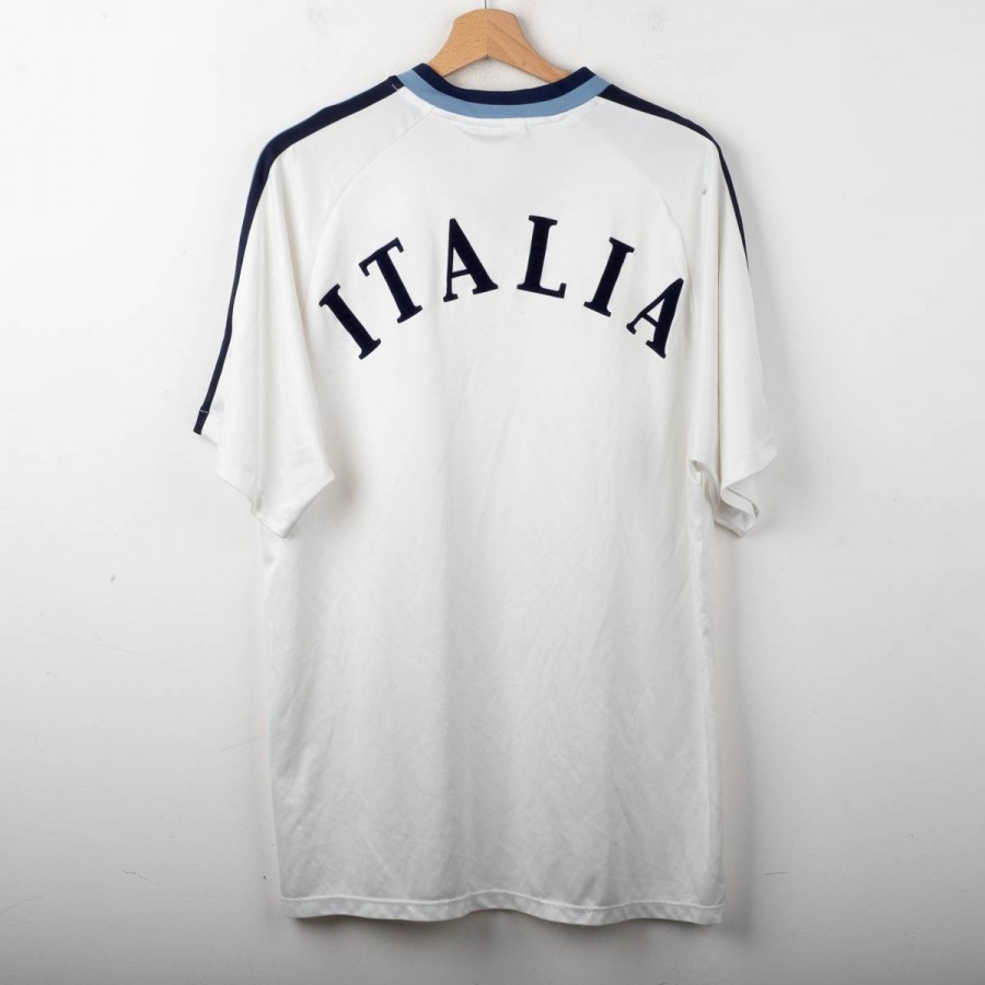 T-shirt di allenamento della Nazionale Italiana utilizzata nel 2004, prodotta da Puma. Modello a maniche corte di colore bianco con dettagli blu sulle spalle e colletto a V. Logo Puma ricamato sul petto destro e stemma Italia con tre stelle cucito lato cuore. Scritta “ITALIA” applicata sul retro in caratteri arcuati. Taglia XL.