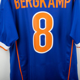 Maglia away della Nazionale Olandese prodotta da Nike per i Mondiali di Francia 1998, personalizzata con il nome Bergkamp e il numero 8. Modello a manica corta di colore blu con dettagli arancioni e bianchi su colletto e maniche. Logo Nike ricamato lato destro e stemma KNVB ricamato lato cuore, accompagnato dalla scritta "FIFA World Cup France 98". Sul retro presente la personalizzazione “BERGKAMP” e numero 8 in arancione. Vestibilità regolare. Taglia M.