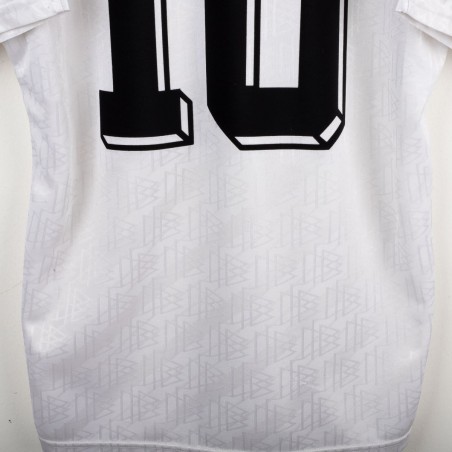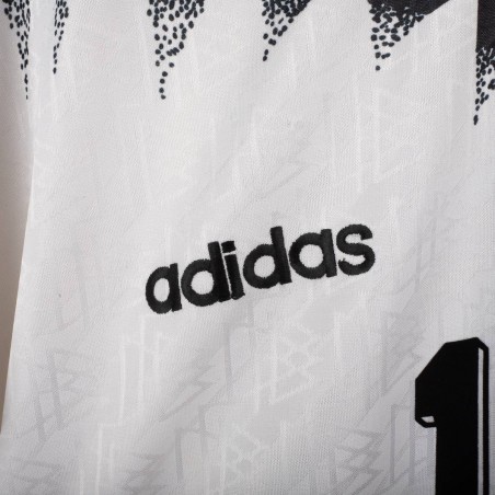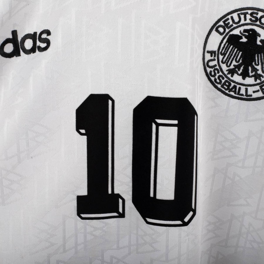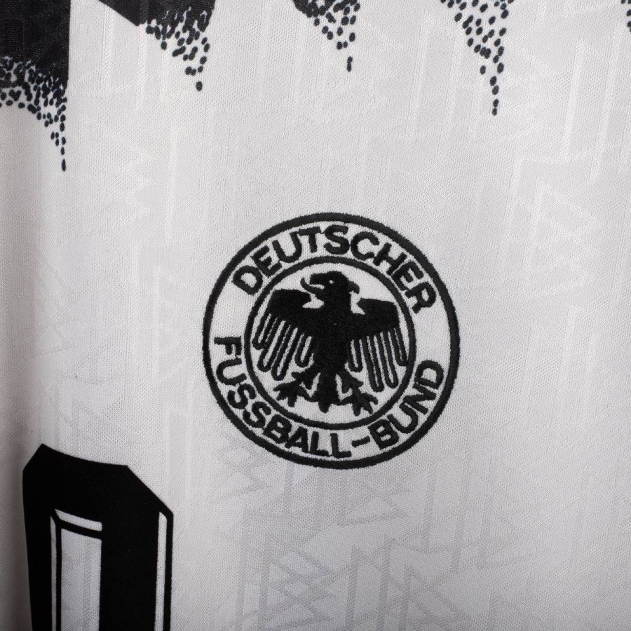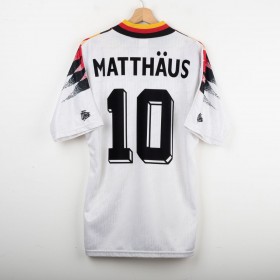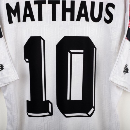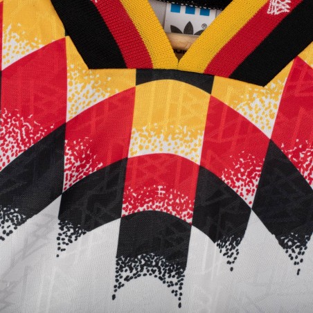 Maglia ufficiale home della Germania prodotta da Adidas per la stagione 1994, con personalizzazione Lothar Matthäus n.10. Modello iconico con design a rombi nei colori della bandiera tedesca (nero, rosso e giallo) sul petto e sulle maniche. Logo Adidas ricamato lato destro e stemma DFB cucito lato cuore in nero. Numero 10 e nome “MATTHÄUS” applicati sul retro in nero.