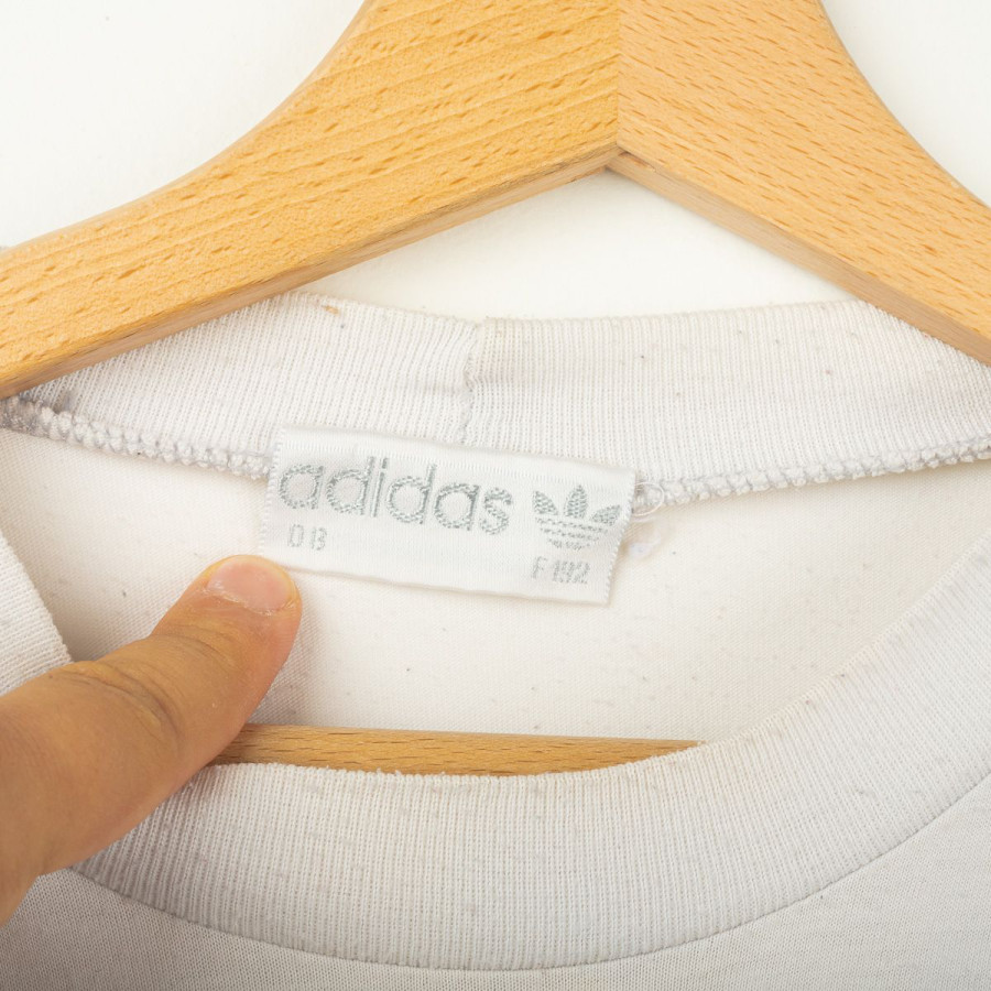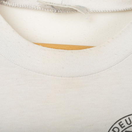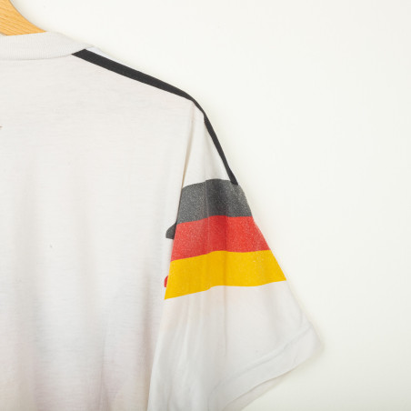 T-shirt di allenamento della Germania prodotta da Adidas per la stagione 1990. Modello bianco con iconiche bande diagonali nei colori della bandiera tedesca: nero, rosso e giallo. Logo Adidas Trefoil e stemma Deutscher Fussball-Bund stampati sul petto. Realizzata in cotone leggero, ideale per l'allenamento e il tempo libero. Vestibilità regolare.