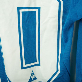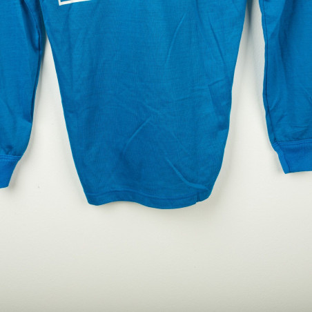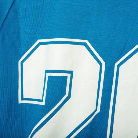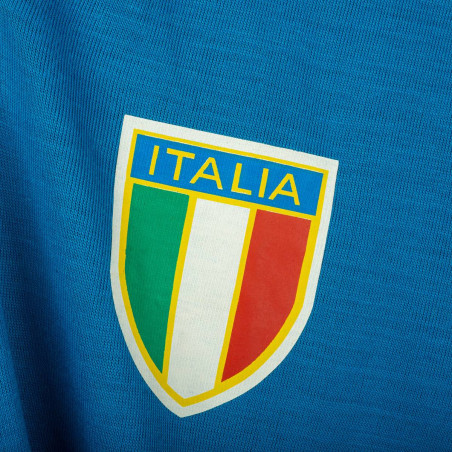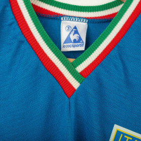 Maglia home dell'Italia utilizzata durante la stagione 1982, prodotta da Le Coq Sportif. Iconico modello azzurro a maniche lunghe con colletto a V rifinito nei colori della bandiera italiana. Logo Le Coq Sportif stampato sul petto destro e stemma Italia con tricolore applicato lato cuore. Numero 20 stampato sul retro in bianco con bordi azzurri, come nella storica divisa di Rossi ai Mondiali di Spagna. Tessuto in cotone leggero, vestibilità regolare. Taglia 3.
