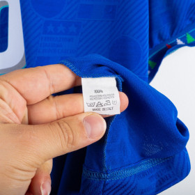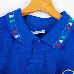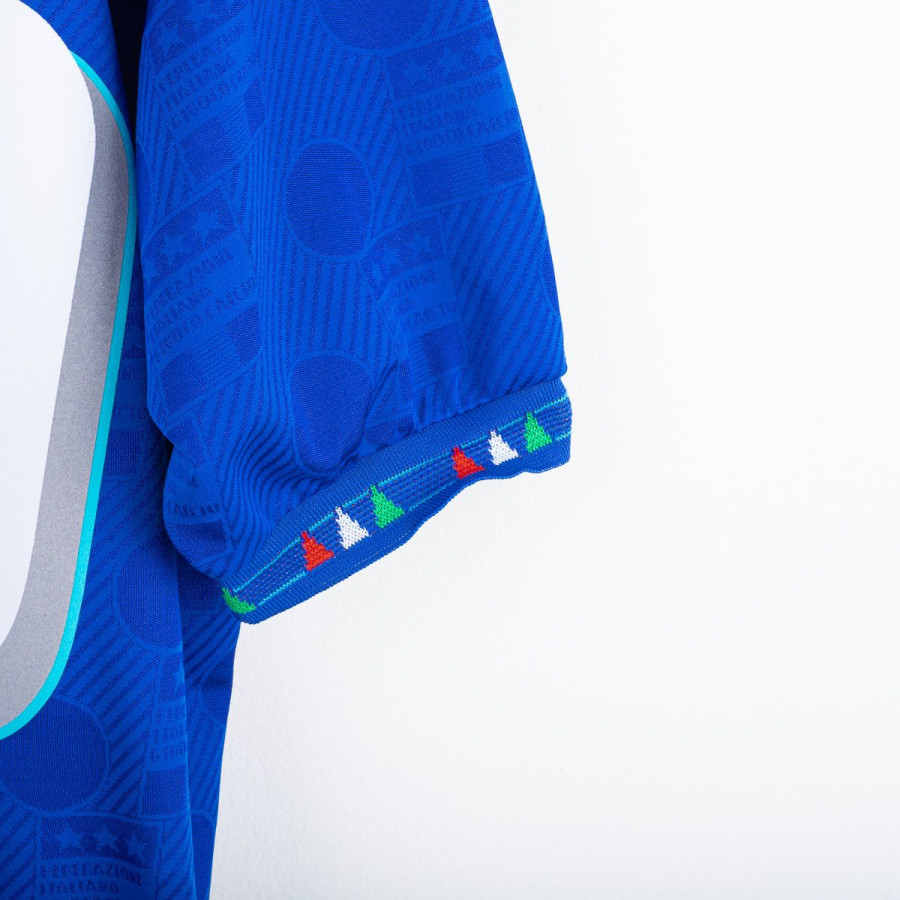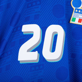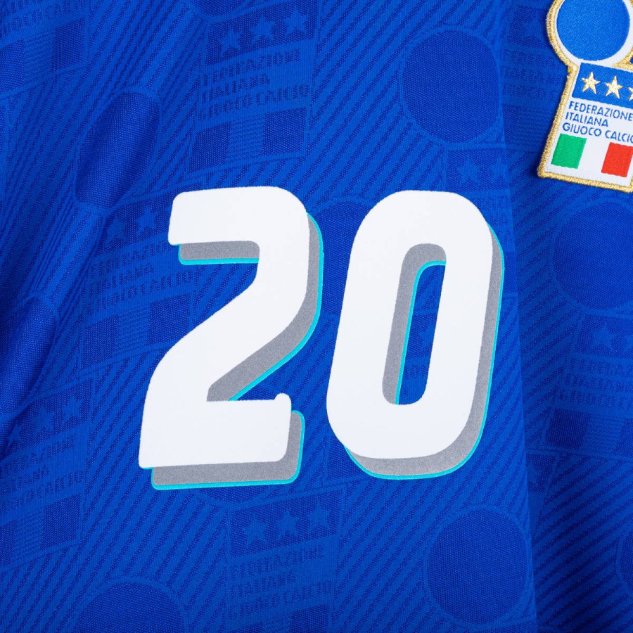 Maglia ufficiale Home della Nazionale Italiana utilizzata durante i Mondiali di USA 1994, realizzata da Diadora. Celebre design azzurro con texture tono su tono raffigurante il logo FIGC, colletto e bordi maniche con dettagli tricolori. Sul petto lo stemma FIGC ricamato e sul retro il nome Signori e il numero 20. Un'iconica maglia che rappresenta una delle pagine più memorabili della storia azzurra. Taglia XL.