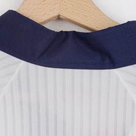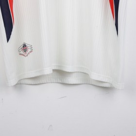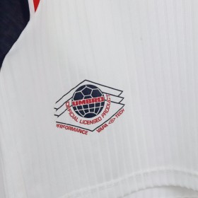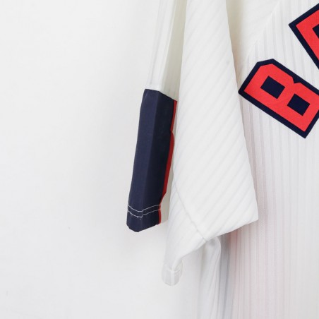 Maglia ufficiale dell'Inghilterra, prodotta da Umbro per la Coppa del Mondo 1998, con nome e numero di David Beckham (7). Il design classico presenta una base bianca con dettagli blu navy e rossi sulle maniche e sul colletto. Sul petto è presente lo stemma della nazionale inglese, accompagnato dal logo Umbro. Sul retro, il nome "Beckham" e il numero 7 in rosso con bordi blu risaltano sullo sfondo bianco. Taglia XL.