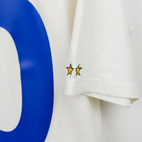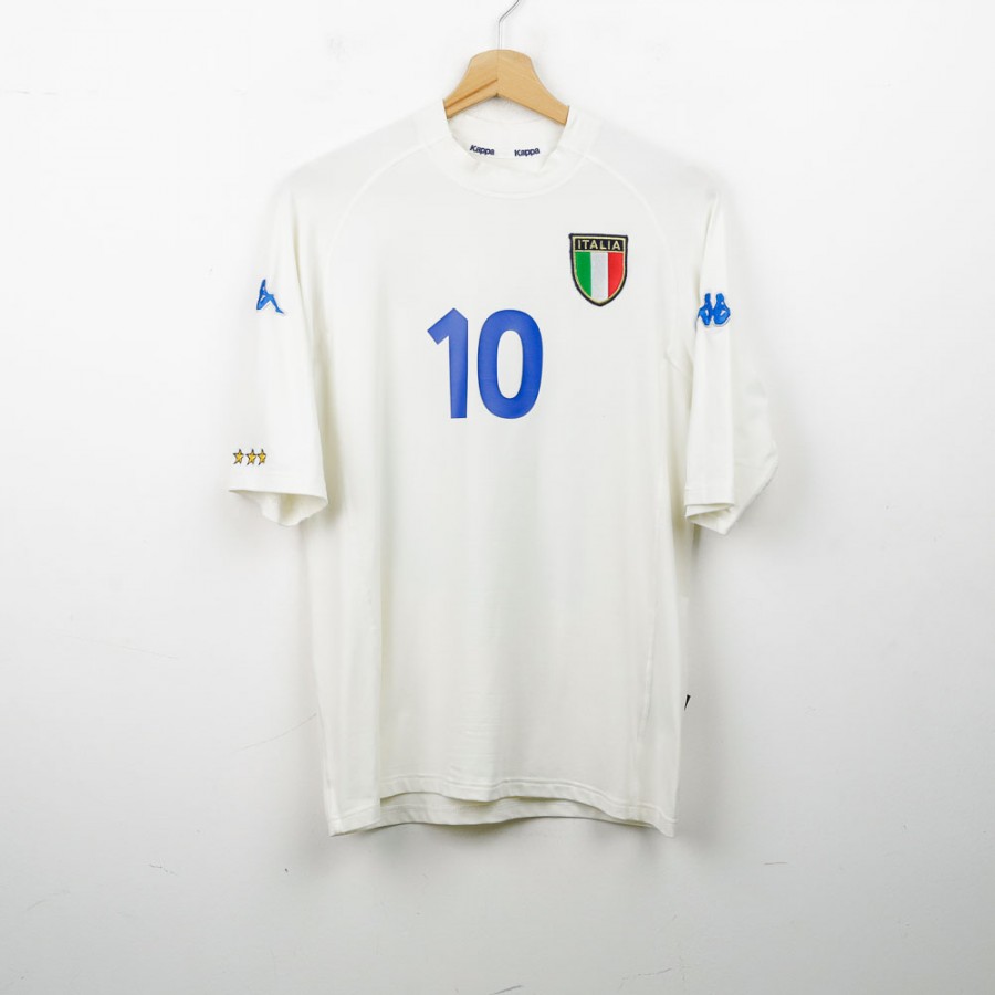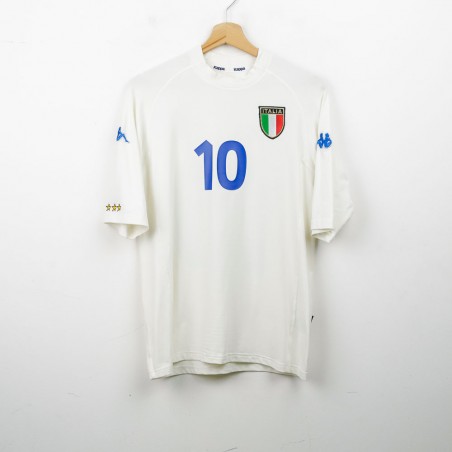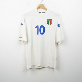 Maglia Away dell'Italia utilizzata nella stagione 2000, realizzata da Kappa e dedicata ad Alessandro Del Piero con il numero 10. Il logo tecnico Kappa è presente sulle maniche, mentre sul petto campeggia lo stemma ufficiale della FIGC. Taglia M visibile sull'etichetta laterale. Questo modello è ricordato per essere stato protagonista durante l'Europeo del 2000, torneo in cui Del Piero, nonostante alcune occasioni mancate nella finale contro la Francia, si confermò come uno dei pilastri della Nazionale azzurra.
