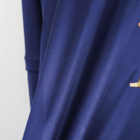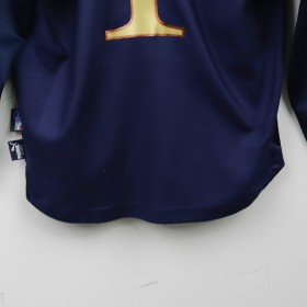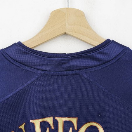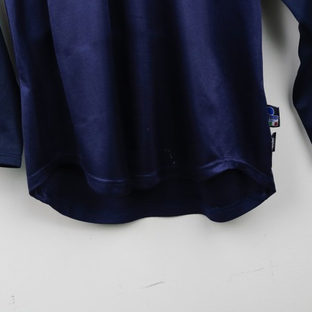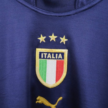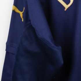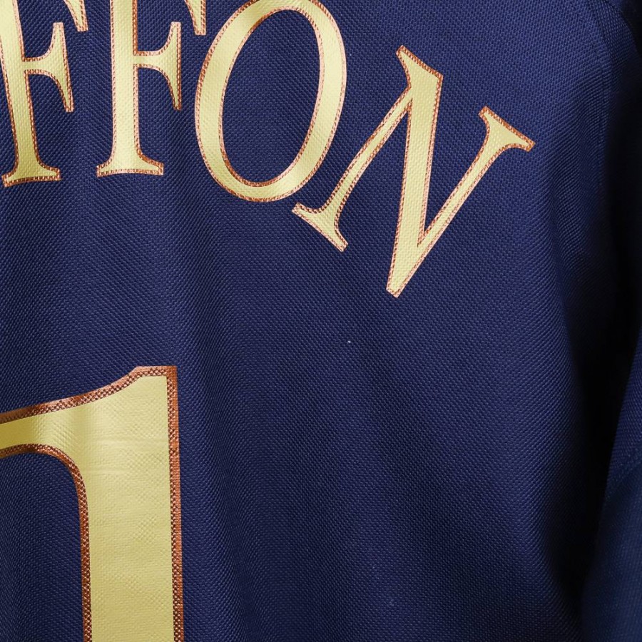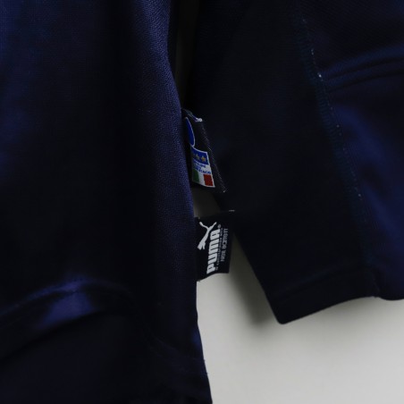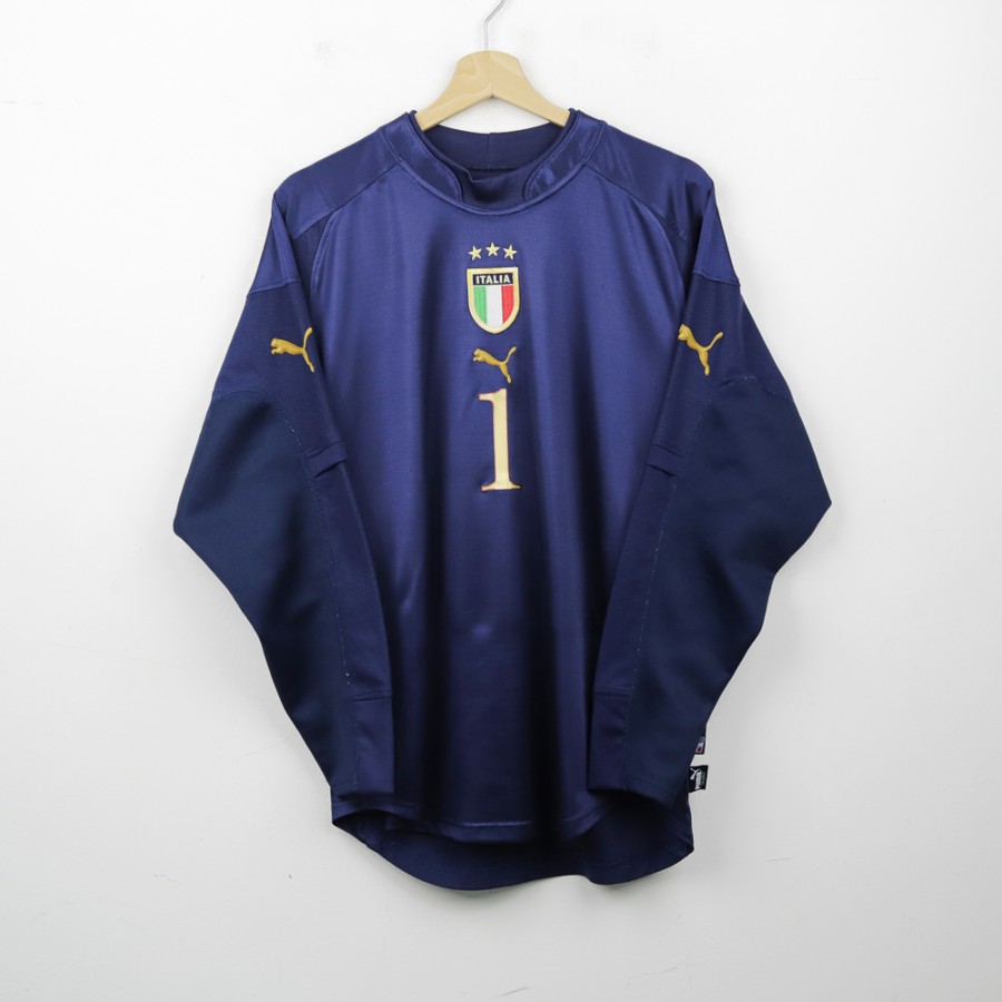 Maglia Portiere Home Italia Puma Buffon 1 2004. Realizzata da Puma, la maglia presenta lo stemma della Nazionale italiana con tre stelle e il numero 1 sul fronte e sul retro, accompagnato dal nome Buffon. Il design è caratterizzato da una tonalità blu scuro con inserti tono su tono e dettagli in oro. Il logo Puma è presente sulle maniche e sul petto. La taglia indicata è M.