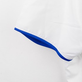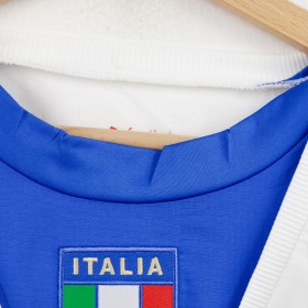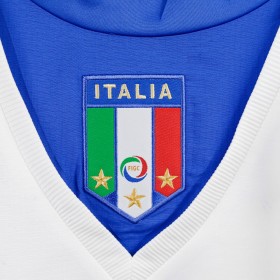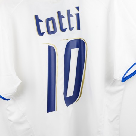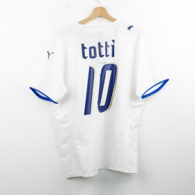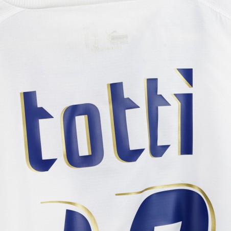 Maglia Away Italia Puma Totti 10 2006 in versione da trasferta, caratterizzata da un elegante design bianco con finiture blu. Sulla parte frontale troviamo lo stemma della FIGC con tre stelle verdi a rappresentare i titoli mondiali conquistati fino a quel momento, il logo tecnico Puma su entrambe le maniche e il numero 10 in posizione centrale. Sul retro spicca la personalizzazione “Totti 10”, dedicata al leggendario capitano della Roma, protagonista con la Nazionale nel memorabile Mondiale vinto in Germania. La taglia riportata è L.