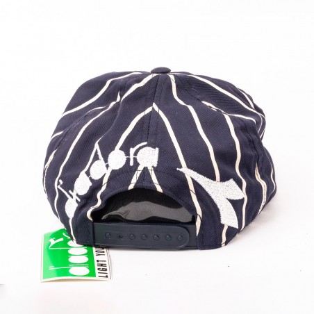 Cappello ufficiale della Nazionale Italiana realizzato da Diadora in occasione dei Mondiali USA 1994. Il modello è a righe verticali blu e bianche con visiera blu, chiusura regolabile sul retro e logo Diadora ricamato. Sul fronte è presente la scritta “ITALIA” in bianco bordato rosso e il logo FIGC stilizzato con tre stelle dorate. Ancora provvisto di cartellino originale “Light Your Fire”.