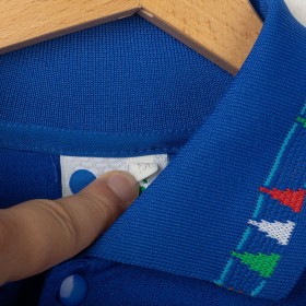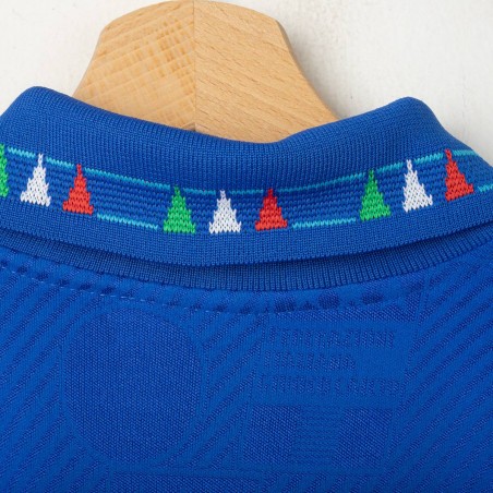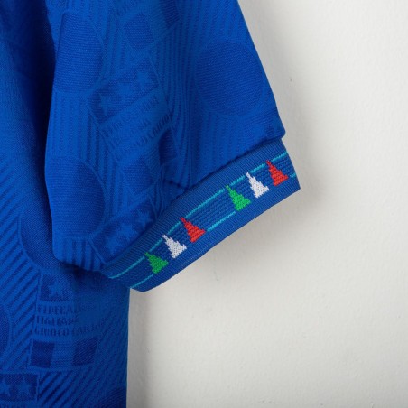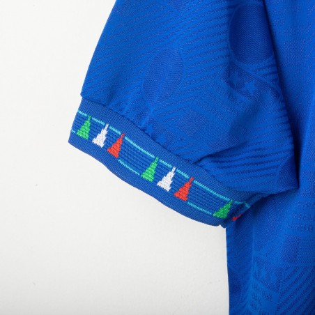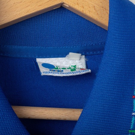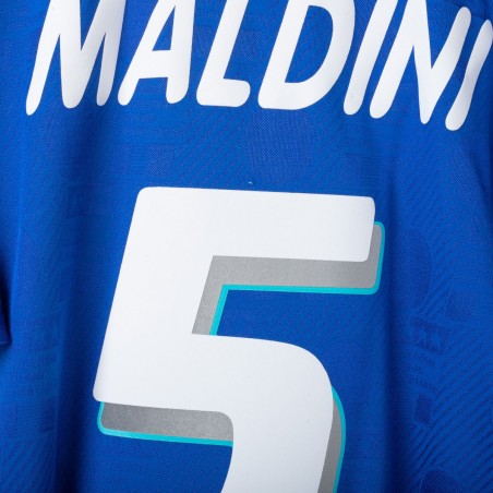 Maglia Home Italia Diadora Maldini 5 USA 1994, taglia M. Prodotta dallo sponsor tecnico Diadora, la maglia presenta il logo stilizzato della FIGC inserito nel simbolo ufficiale del Mondiale 1994 sul petto, il numero 5 in bianco su fronte e retro e il nome Maldini sulla schiena. Il colletto e le maniche sono arricchiti da motivi tricolore, tipici di quel periodo.