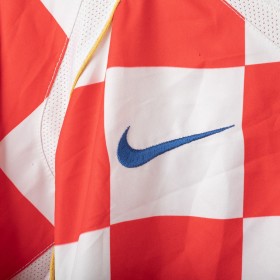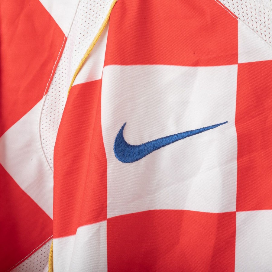 Maglia Home Croazia Nike 2004, taglia M. Questo iconico design a scacchi rossi e bianchi, simbolo indiscusso della nazionale croata, è realizzato da Nike e presenta il logo federale al centro del petto. Sul fronte è presente anche il caratteristico swoosh Nike blu. La maglia include inserti gialli lungo i lati e dettagli blu sui bordi delle maniche, con una costruzione leggera e traspirante pensata per il comfort in campo.