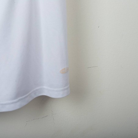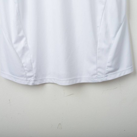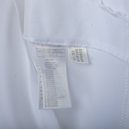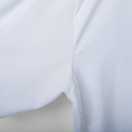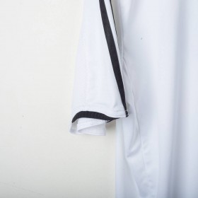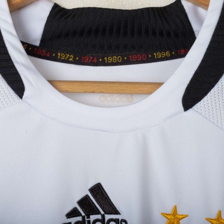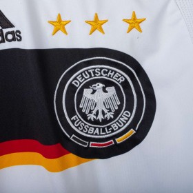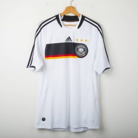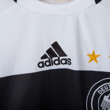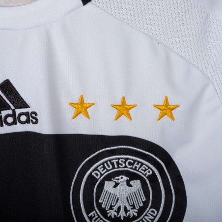 Maglia home ufficiale della Nazionale Tedesca per gli Europei del 2008, prodotta da Adidas. Caratterizzata da un design moderno e dinamico, la maglia è bianca con una fascia orizzontale nera arricchita da dettagli nei colori della bandiera tedesca. Presenta tre stelle sopra lo stemma della DFB, a simboleggiare i titoli mondiali vinti fino a quel momento. Le tre strisce nere Adidas decorano le spalle, mentre lo scollo è in stile moderno con inserti neri. La maglia è in taglia L.
