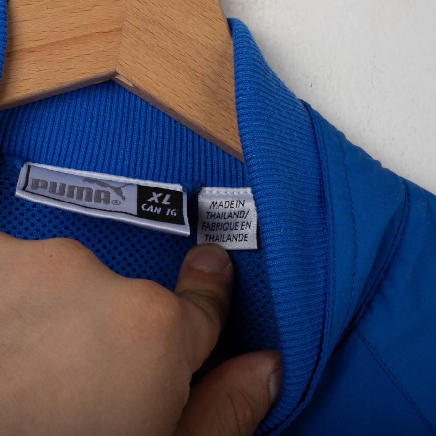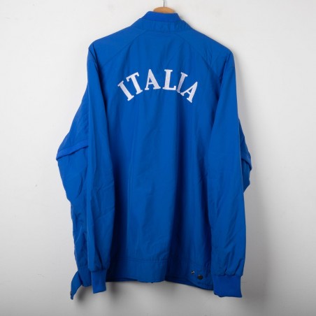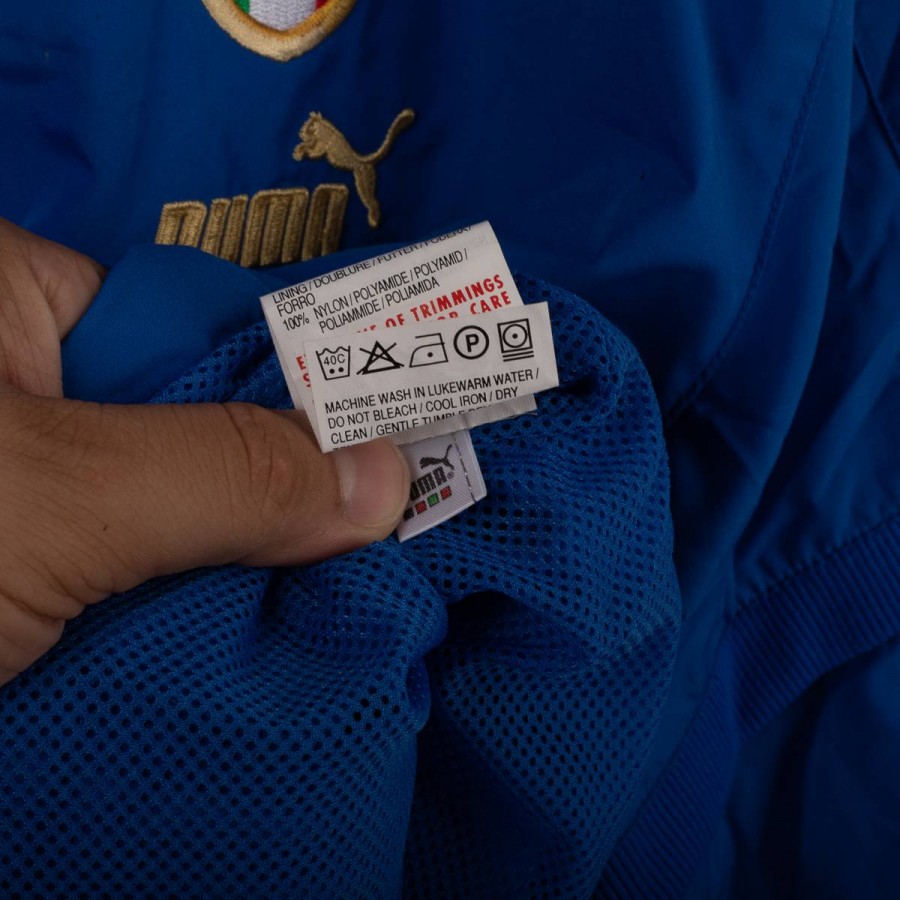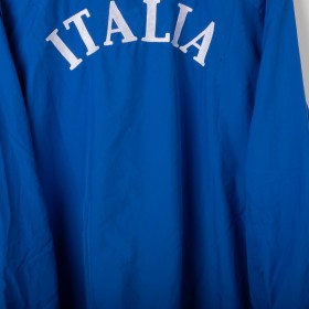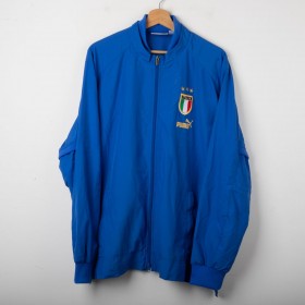 Giacca rappresentativa della Nazionale Italiana realizzata da Puma nel 2004. Colore azzurro, con scritta "ITALIA" cucita sul retro e stemma FIGC a tre stelle ricamato sul petto. Logo Puma ricamato in oro. Collo bomber, chiusura con zip integrale e polsini elasticizzati. Interno in mesh traspirante. Taglia XL. Prodotta in Polonia.