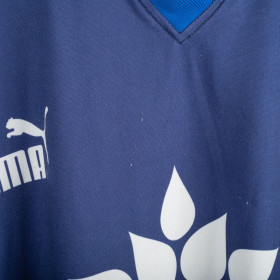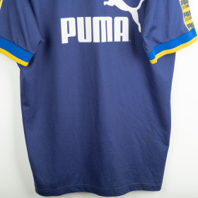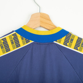 Maglia da allenamento ufficiale del Parma Calcio stagione 1995/1996, realizzata da Puma. Modello in tessuto tecnico blu con dettagli gialli e azzurri sui bordi delle maniche e sul colletto. Sponsor frontale Parmalat in bianco, logo Puma e stemma Parma A.C. stampati sul petto. Design classico con bande Puma King sulle spalle, simbolo di un'epoca d'oro per il club emiliano.