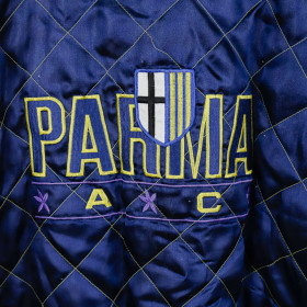 Giacca college ufficiale del Parma per la stagione 1994/1995, prodotta da Umbro, taglia L. Questa giacca bomber presenta una base blu trapuntata con maniche gialle, creando un contrasto iconico e in linea con i colori tradizionali del club. Sulla parte posteriore è ricamato il logo del Parma A.C., insieme allo stemma crociato e alla scritta "Parma" in giallo e bianco. Il colletto, i polsini e il bordo inferiore sono a coste con strisce gialle, blu e bianche, richiamando ulteriormente l'identità della squadra. La chiusura frontale con zip completa il look sportivo e vintage di questo pezzo.