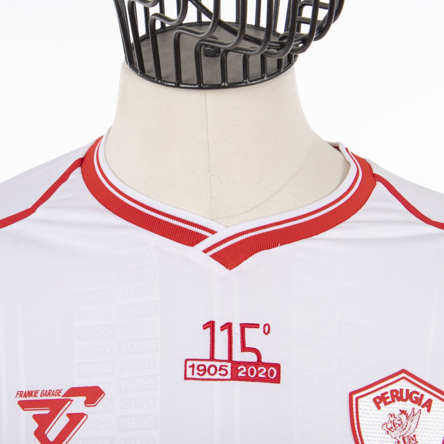 Modello maglia away a manica corta di colore bianco con inserti rossi. La divisa è ispirata ai 115 anni di storia del club biancorosso. Il marchio “115” è posizionato in ricamo al centro del petto per celebrare e ricordare la meravigliosa e lunga storia dell'AC Perugia. Il collo ha un importante richiamo storico: lo scollo a V formato dalla sovrapposizione della costina, come quello della stagione del 1987-1988 del Perugia di Ravanelli. Sul petto, a destra, è applicato il logo dello sponsor tecnico Frankie Garage, mentre al lato cuore applicato lo stemma societario del Perugia.
