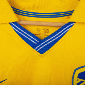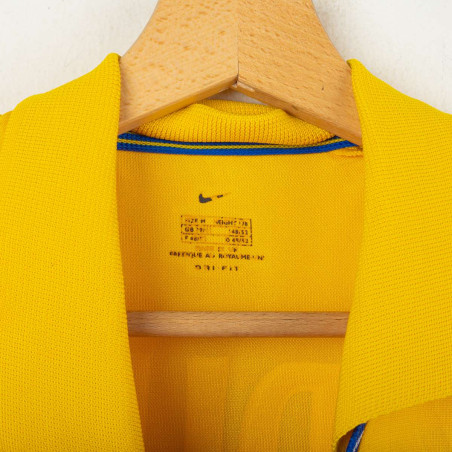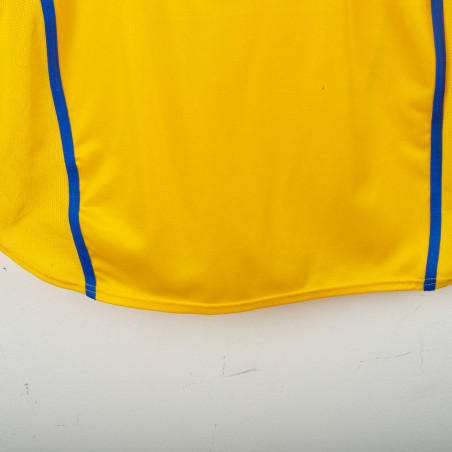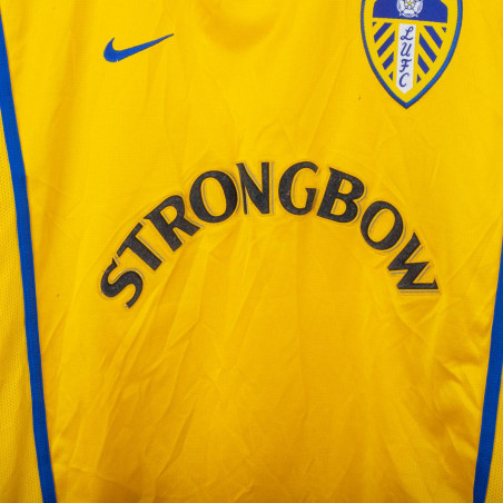 Maglia da trasferta del Leeds United indossata nella stagione 2000/2001, prodotta da Nike. Modello Dri-Fit di colore giallo con dettagli blu, sponsor tecnico Nike e main sponsor Strongbow applicati sul fronte. Stemma del club cucito lato cuore. Nome "VIDUKA" e numero 9 sul retro flock nero con bordatura bianca. Colletto a polo con scollo a V in maglia rigata. Taglia M, made in UK. Vestibilità regolare. Maglia originale vintage degli anni 2000, indossata durante la storica cavalcata in Champions