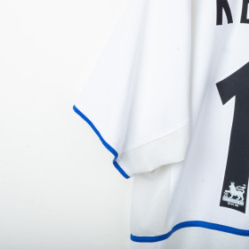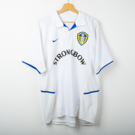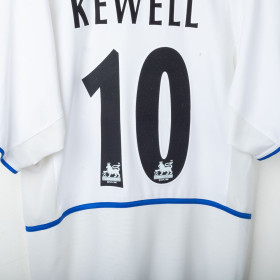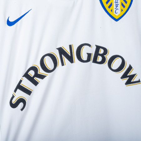 Maglia home del Leeds United utilizzata nella stagione 2002/2003, prodotta da Nike. Colore bianco con dettagli blu su colletto e maniche. Stemma societario cucito lato cuore. Logo Nike ricamato in blu lato destro. Sponsor centrale “Strongbow” in flock nero con bordo dorato. Nome “KEWELL” e numero 10 sul retro applicati in flock nero, con logo Premier League alla base del numero. Colletto a polo con inserti blu. Vestibilità regolare. Taglia M.