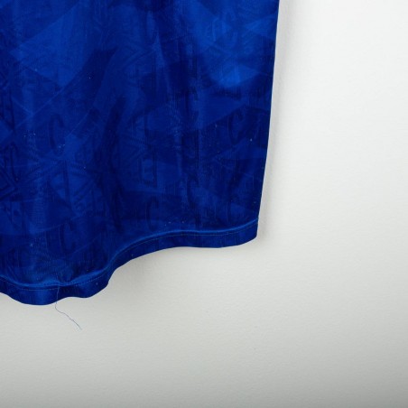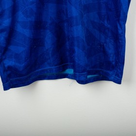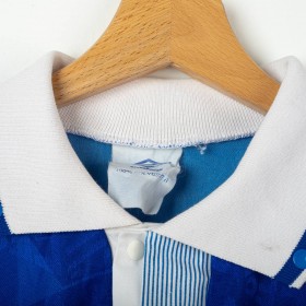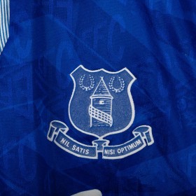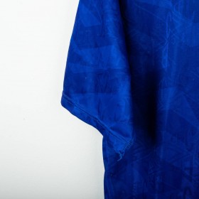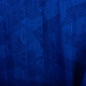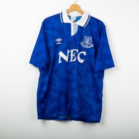 Maglia home dell'Everton prodotta da Umbro per la stagione 1990/1991. Classico design anni '90 con motivo geometrico jacquard tono su tono e logo “EFC” incorporato nella trama. Colore blu con colletto bianco a polo con inserto centrale a righe azzurre. Logo Umbro ricamato sul petto destro, sponsor NEC stampato al centro e stemma Everton applicato lato cuore. Maniche corte con scritta “EFC” sulla manica sinistra. Vestibilità regolare. Taglia L.