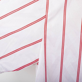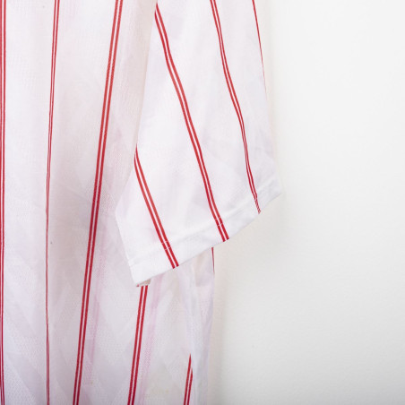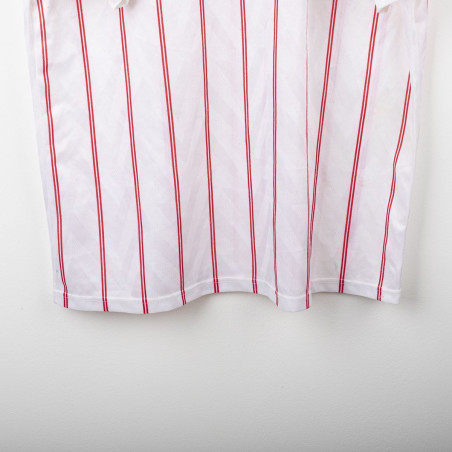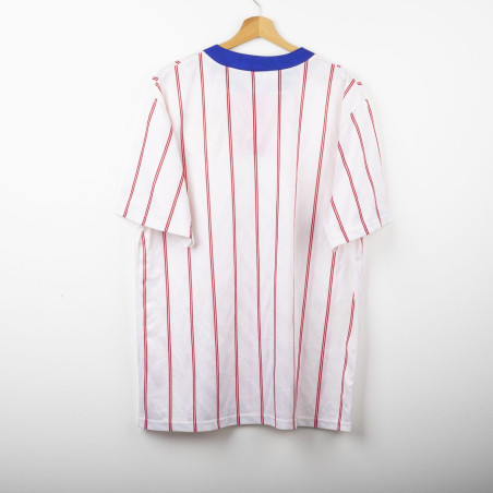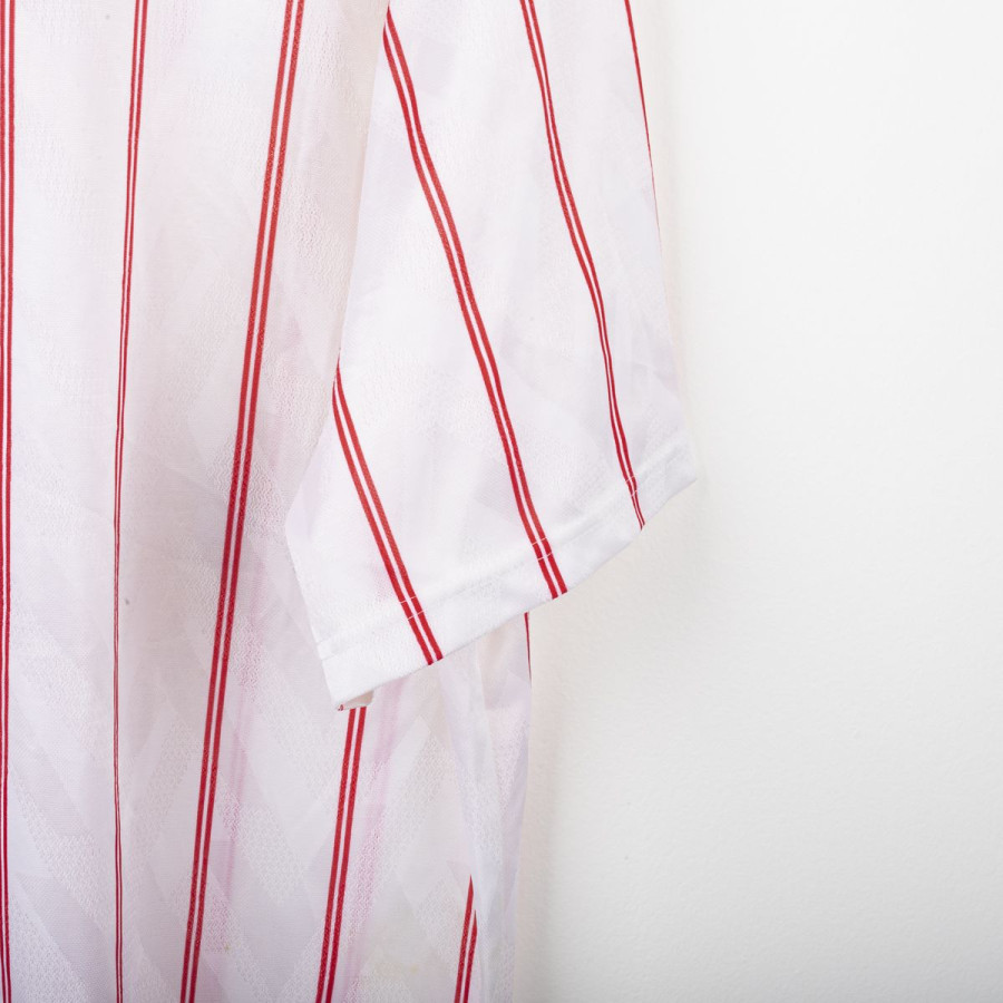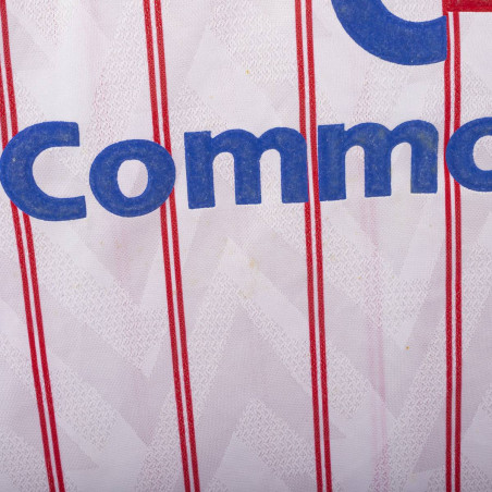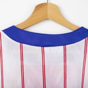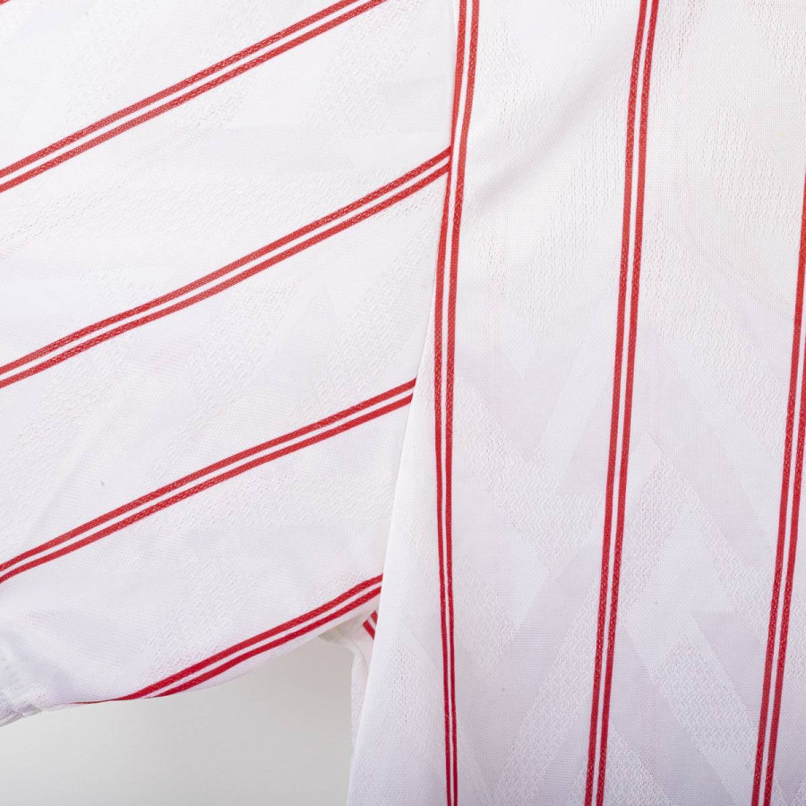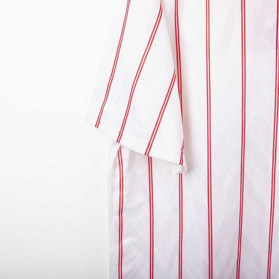 Maglia away del Chelsea utilizzata nella stagione 1991/1992, prodotta da Umbro. Modello bianco con sottili strisce verticali rosse, colletto blu e lacci rossi. Stemma CFC cucito lato cuore e logo Umbro ricamato sul petto destro. Sponsor Commodore applicato in flock al centro. Taglia XL. Una maglia iconica dei Blues dei primi anni '90, indossata nelle ultime stagioni della First Division prima della nascita della Premier League.