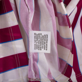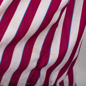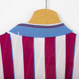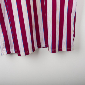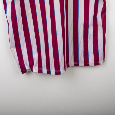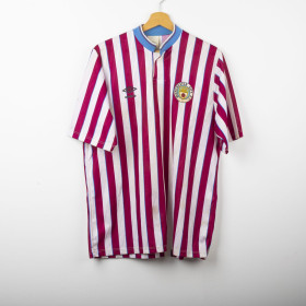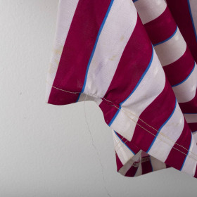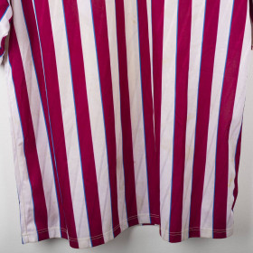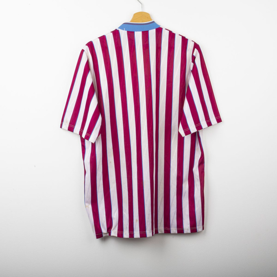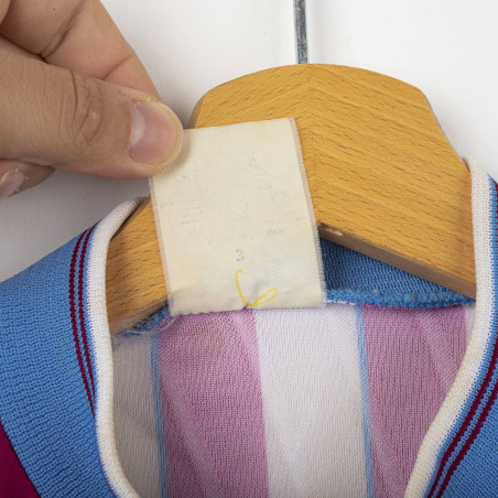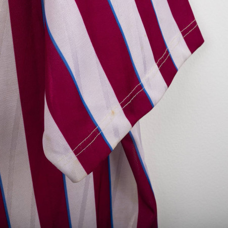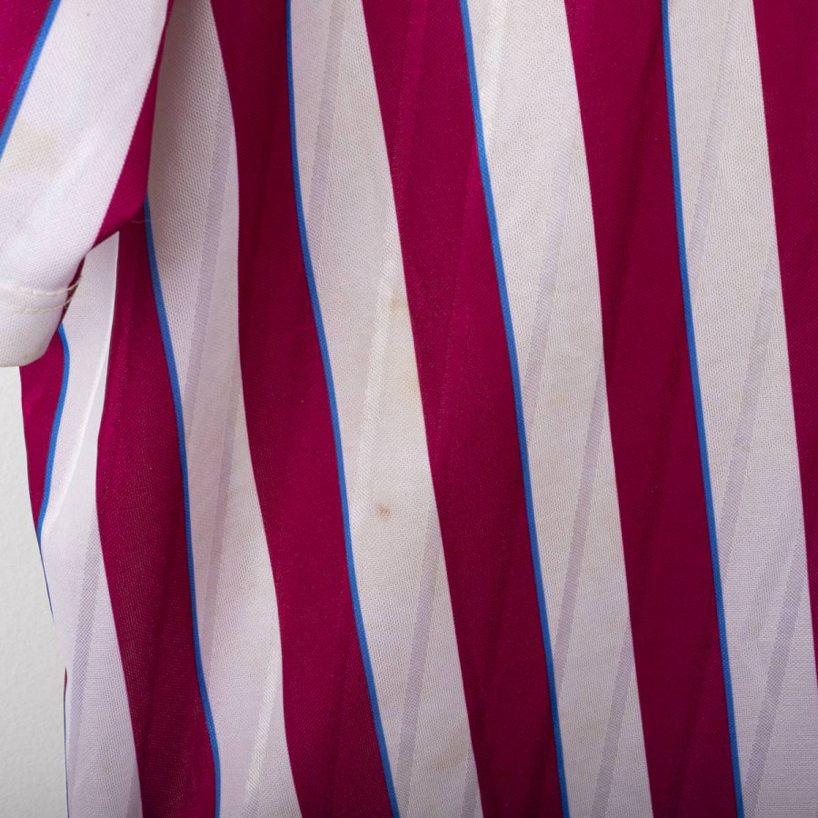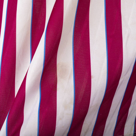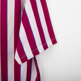 Maglia away del Manchester City utilizzata nella stagione 1989/1990, prodotta da Umbro. Modello a strisce verticali bordeaux e bianche con finiture celesti. Colletto stile coreano celeste con dettagli bordeaux e abbottonatura a pressione. Stemma Manchester City applicato lato cuore e logo Umbro ricamato lato destro. Tessuto jacquard con motivo geometrico tipico dell'epoca. Taglia XL.
