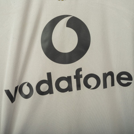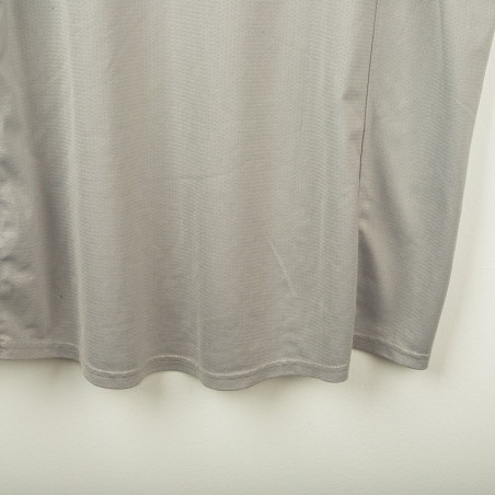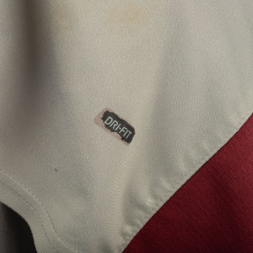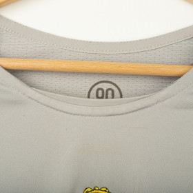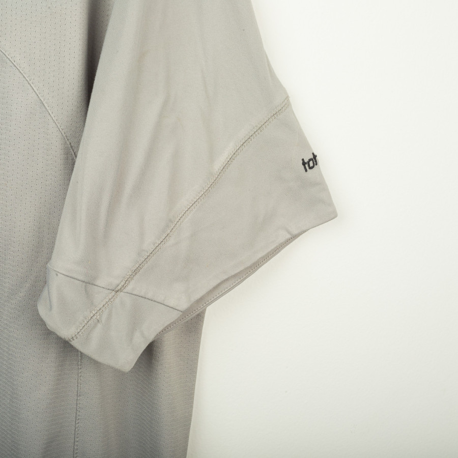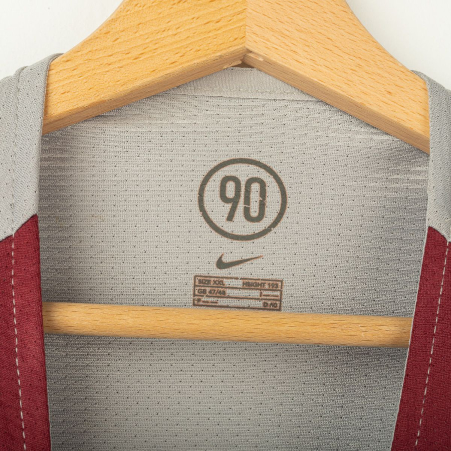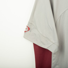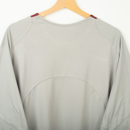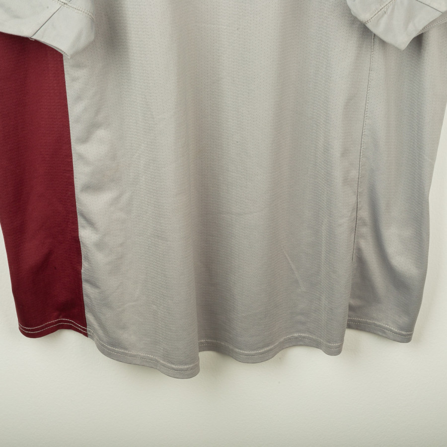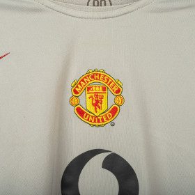 T-shirt da allenamento del Manchester United utilizzata nella stagione 2005/2006, prodotta da Nike. Colore grigio con inserti bordeaux ai lati e spalle. Logo Nike ricamato in rosso sul petto destro e stemma Manchester United cucito lato cuore. Sponsor Vodafone applicato in stampa nera al centro. Tecnologia Dri-Fit per una maggiore traspirabilità. Dettagli Total 90 ricamati sulle maniche. Vestibilità ampia e comoda. Taglia XXL.