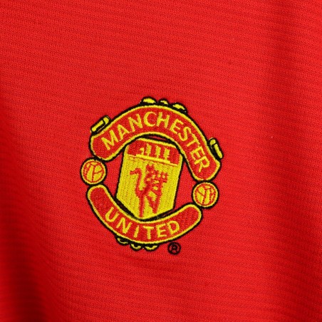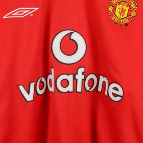 Maglia home ufficiale del Manchester United, stagione 2000/2001, prodotta dallo sponsor tecnico Umbro e personalizzata con il nome e il numero 11 di Ryan Giggs. Il design è classico, con il tradizionale colore rosso e dettagli neri e bianchi sul colletto e sulle maniche. Lo stemma del club è cucito lato cuore, mentre il logo Umbro è ricamato sul lato destro del petto. Al centro della maglia spicca lo sponsor commerciale Vodafone. Sul retro, il nome "Giggs" e il numero 11 sono applicati in bianco con bordi neri. Modello Sportwool, taglia L.