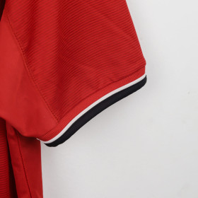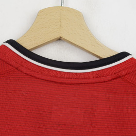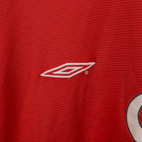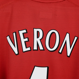 Maglia home del Manchester United per la stagione 2001/2002, prodotta da Umbro. La divisa si presenta nel classico colore rosso, con dettagli neri e bianchi su colletto e maniche. Sul petto troviamo il logo Umbro e lo stemma del club, mentre al centro spicca lo sponsor commerciale Vodafone. Sul retro è stampato il nome "Veron" con il numero 4, indossato dall'argentino Juan Sebastián Verón.