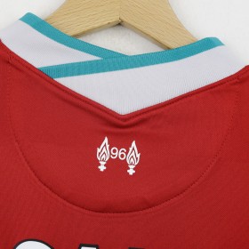 Maglia home del Liverpool per la stagione 2020/2021, prodotta da Nike. Il classico rosso dei Reds è impreziosito da dettagli bianchi e turchesi su colletto e maniche. Sul petto è presente il logo Nike, il main sponsor Standard Chartered e il celebre Liver Bird, simbolo del club. Sul retro troviamo il nome "M. Salah" e il numero 11, con il logo della Premier League.