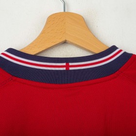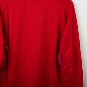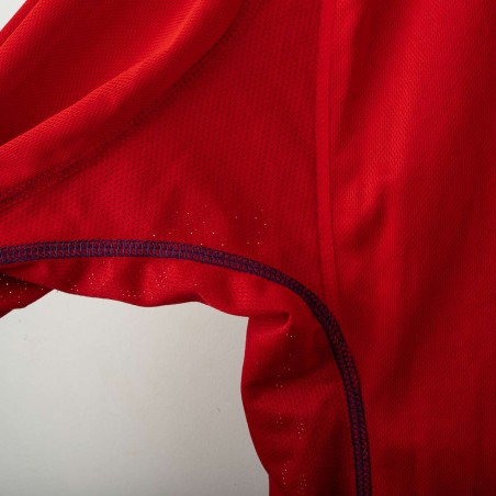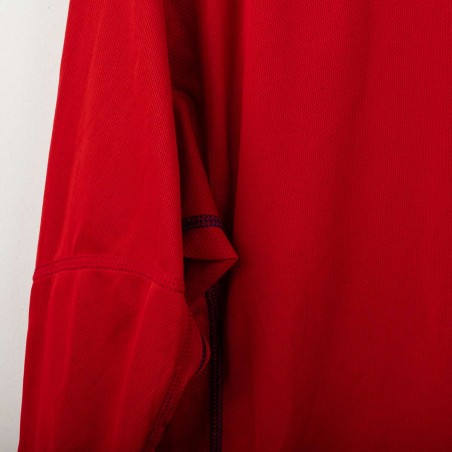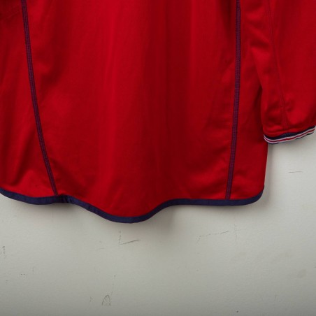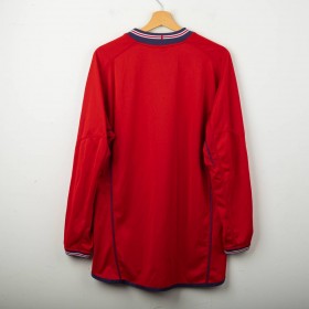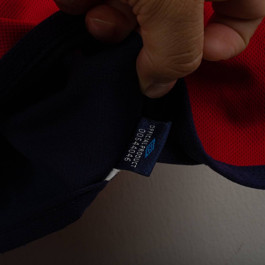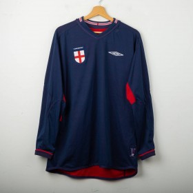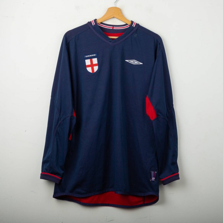 Maglia away reversibile dell'Inghilterra utilizzata tra il 2002 e il 2004, prodotta da Umbro. Lato rosso con stemma dei Tre Leoni cucito e logo Umbro ricamato. Lato blu navy con stemma di San Giorgio e logo Umbro. Colletto a costine tricolore, dettagli in mesh sotto le maniche. Etichetta commemorativa cucita sul fondo con data 2004. Vestibilità regolare, manica lunga. Taglia M. Rara versione reversibile originale anni 2000.