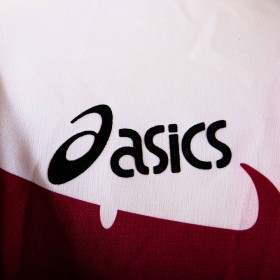 Maglia vintage Reggina Asics della stagione 2004/2005 con nome e numero PAREDES 5 in flock sul retro, con toppa della Lega Calcio applicata sulla manica destra. Maglia dal classico colore granata della squadra calabrese con applicati sul fronte loghi ASICS, Reggina, Gicos e Stocco&Stocco.