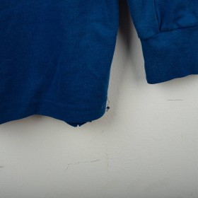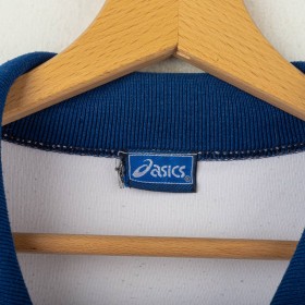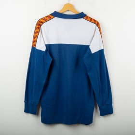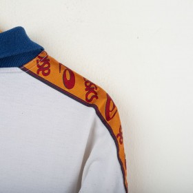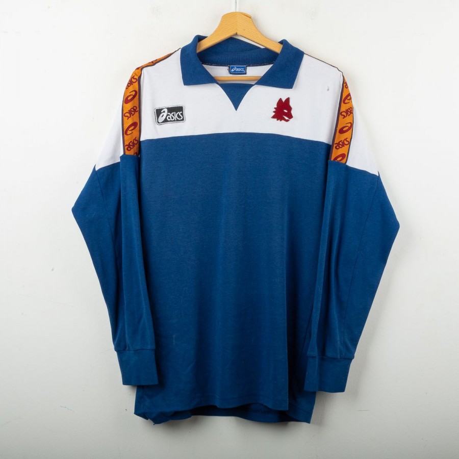 Polo della AS Roma indossata nella stagione 1995/1996, prodotta da Asics. Colore blu con fascia orizzontale bianca sul petto e inserti arancioni con logo Asics sulle spalle. Stemma della Roma in feltro rosso cucito lato cuore. Logo Asics ricamato in bianco su patch nera lato destro. Colletto a polo blu. Maniche lunghe con polsini elasticizzati. Vestibilità regolare.
