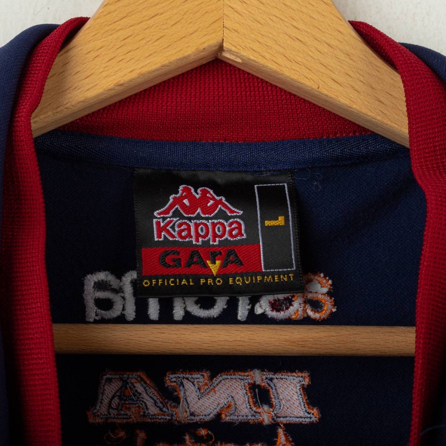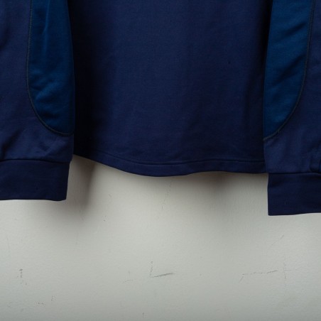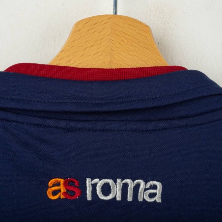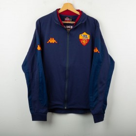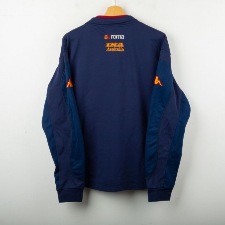 Giacca da allenamento dell'AS Roma utilizzata nella stagione 2000/2001, prodotta da Kappa. Colore blu navy con inserti blu scuro sulle maniche e dettagli in rosso sul colletto. Logo Kappa ricamato in arancione sul petto destro e su entrambe le maniche, stemma AS Roma ricamato lato cuore. Sul retro, scritta “as roma” e sponsor INA Assitalia ricamati in bianco e arancione. Chiusura a zip intera frontale. Vestibilità regolare. Taglia L.