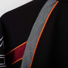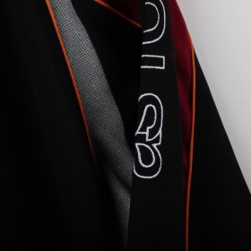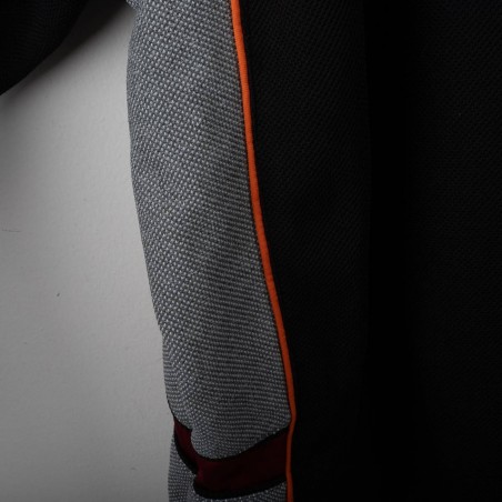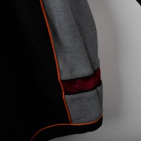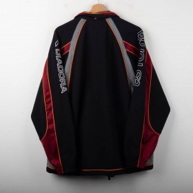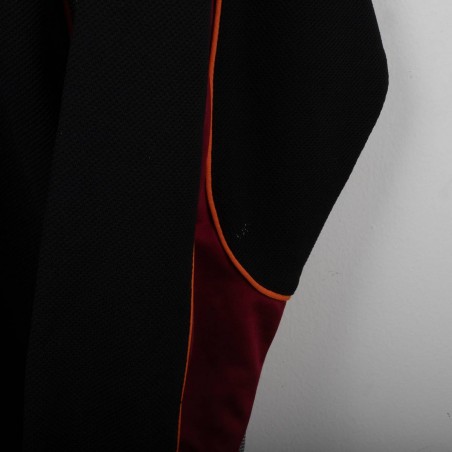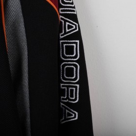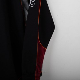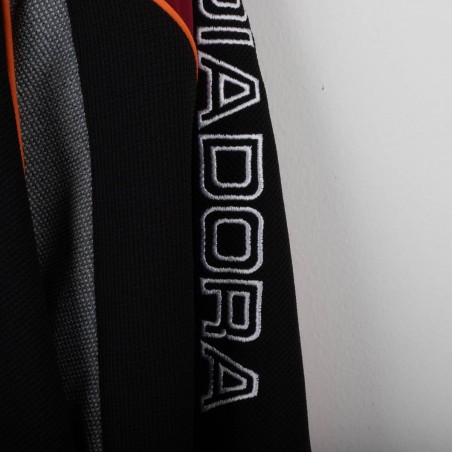 elpa full zip dell'AS Roma utilizzata nella stagione 1998/1999, prodotta da Diadora. Colore nero con inserti bordeaux e dettagli arancioni. Logo Diadora ricamato in bianco sul petto destro, stemma AS Roma in patch gommata lato cuore con scritta “as roma” ricamata in arancione. Inserti grigi sulle spalle e lungo la zip. Logo Diadora ricamato anche sulle maniche. Vestibilità regolare. Taglia L.