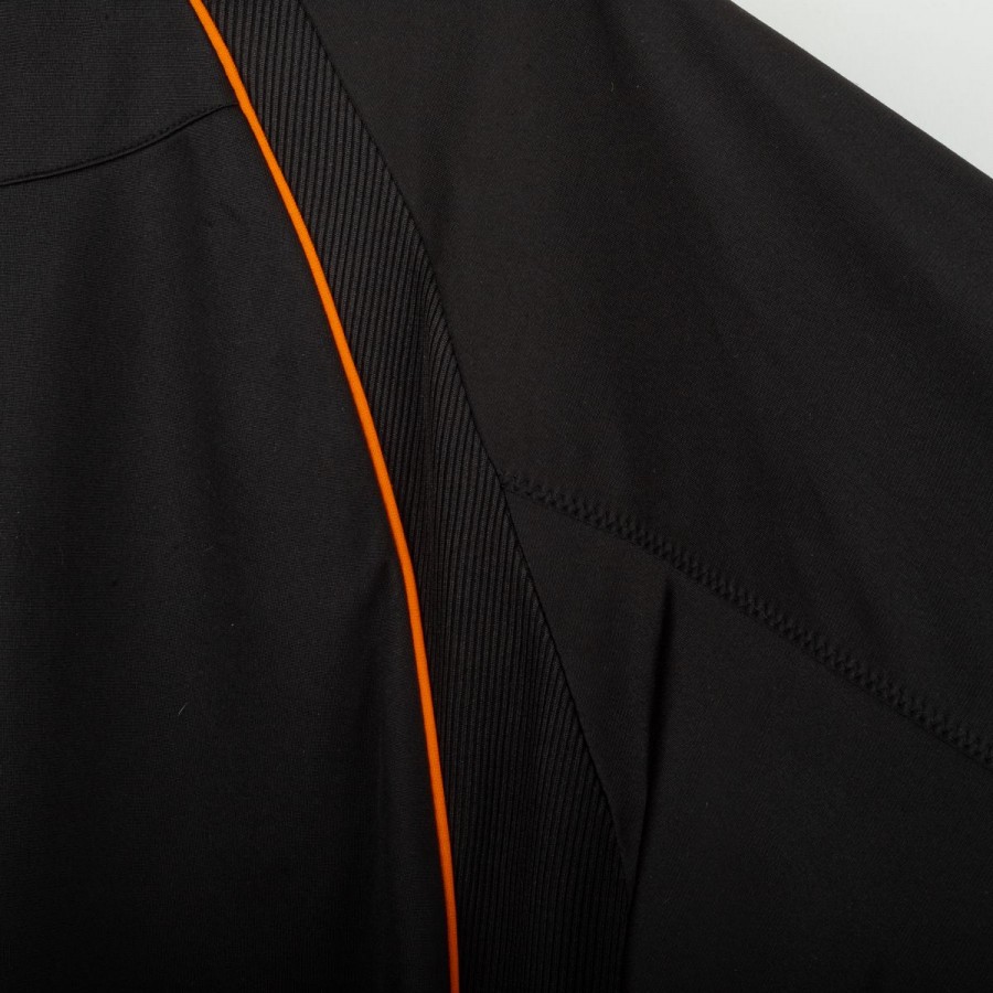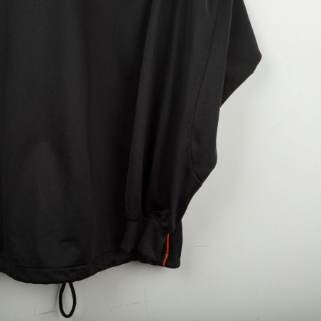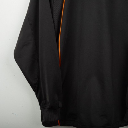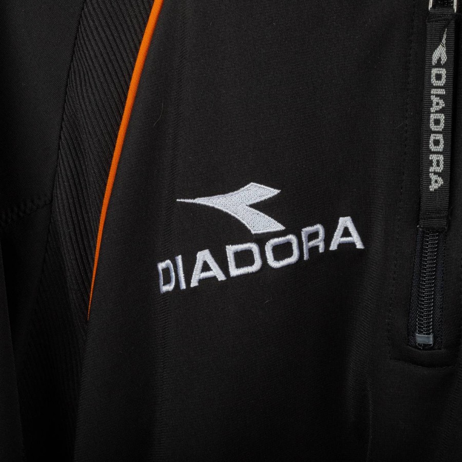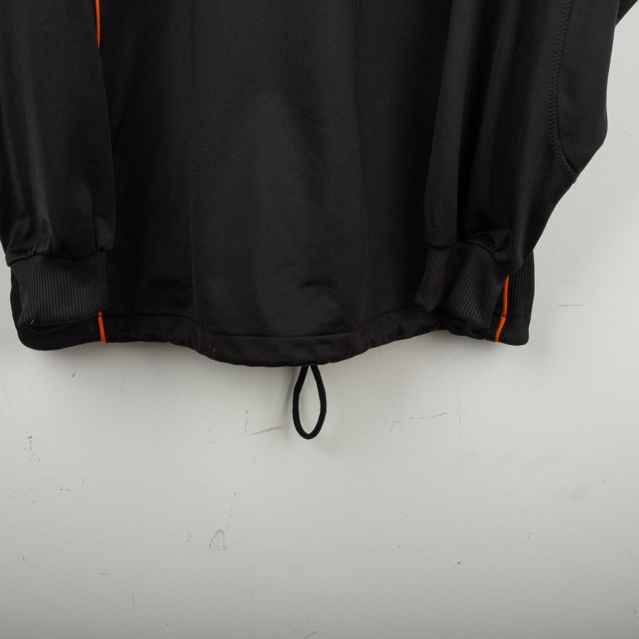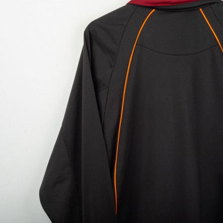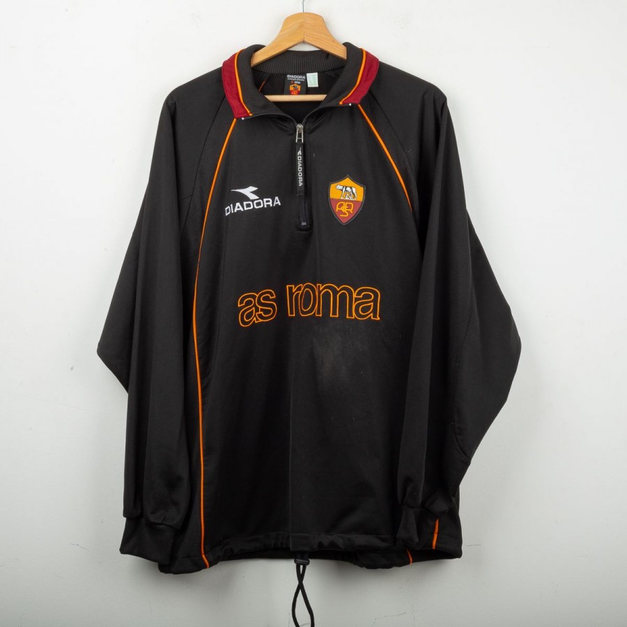 Felpa vintage AS Roma della stagione 1997/1998 realizzata da Diadora. Colore nero con dettagli arancioni e rossi sul colletto. Logo Diadora ricamato sul petto e scritta “as roma” centrale applicata. Stemma AS Roma applicato in gommina sul lato cuore. Mezza zip frontale con tirante personalizzato Diadora. Modello ampio con polsini elasticizzati e coulisse regolabile sul fondo. Taglia 50 (corrispondente a L/XL). Prodotto ufficiale Diadora, fornitore tecnico AS Roma.