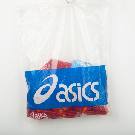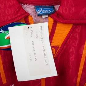 Maglia home AS Roma della stagione 1996/1997 realizzata da Asics. Colore rosso granata con pinstripes gialle e motivo jacquard con scritta “AS ROMA”. Colletto a polo con dettagli gialli. Sponsor centrale INA Assitalia applicato in sublimatico. Logo Asics ricamato sul petto destro e stemma AS Roma in gommina applicato lato cuore. Vestibilità regolare anni '90. Taglia XL, nuova con cartellini e busta originale Asics. Prodotto ufficiale Asics, fornitore tecnico AS Roma.