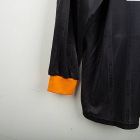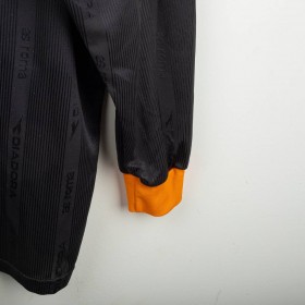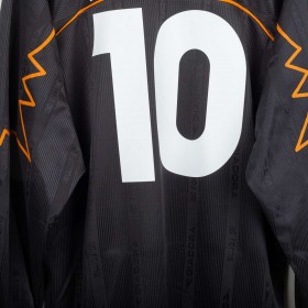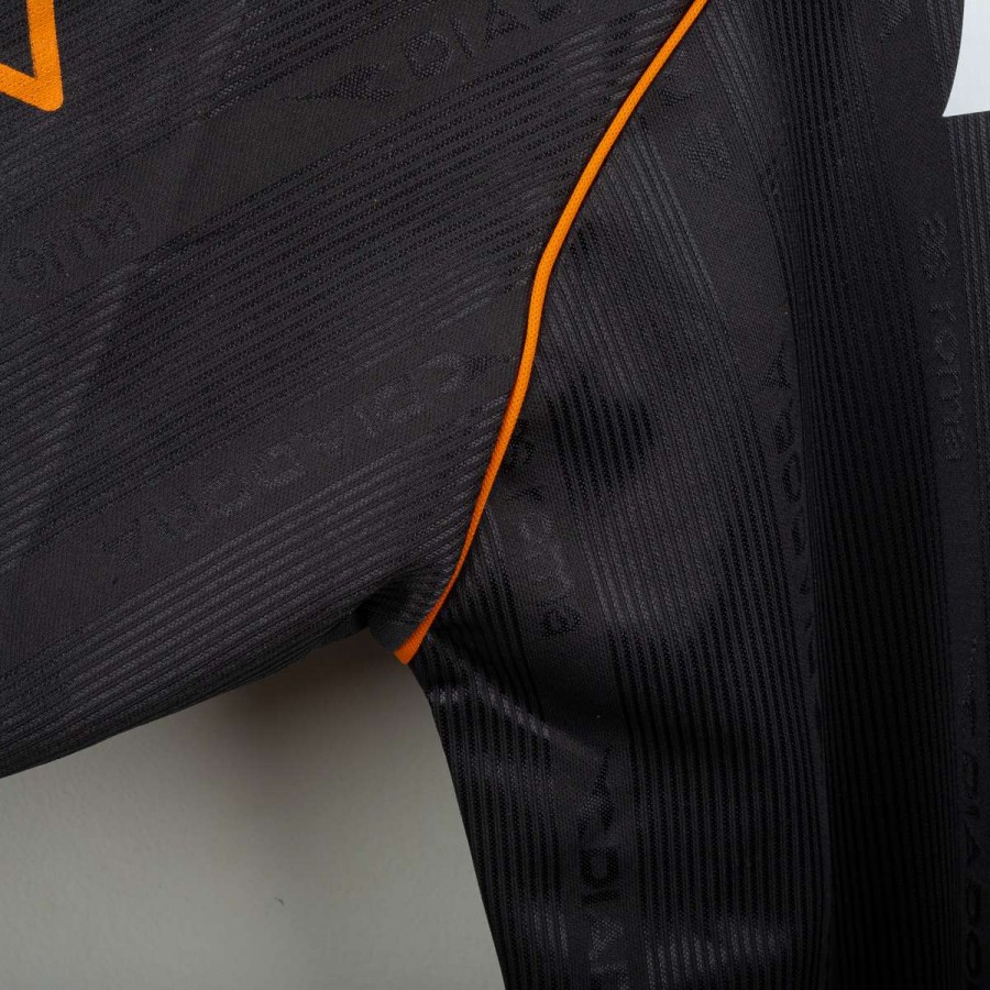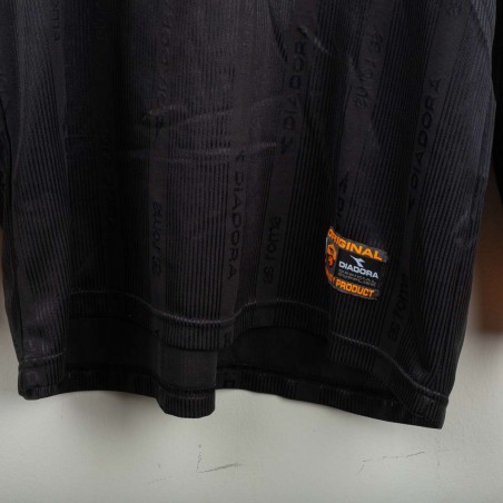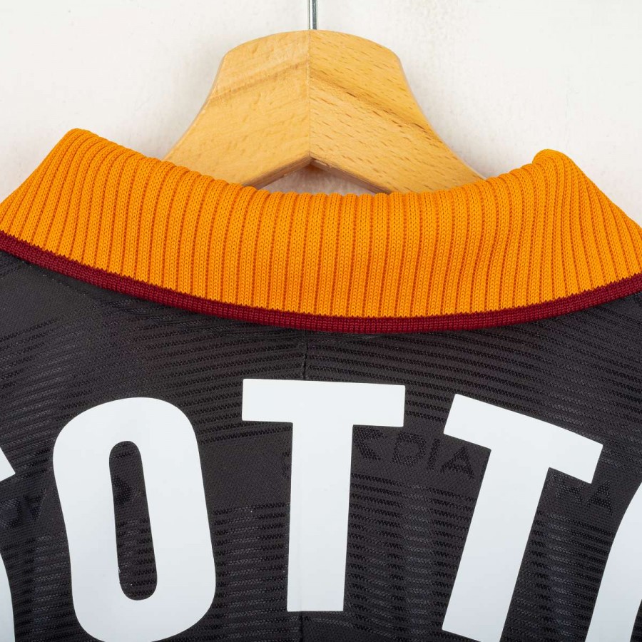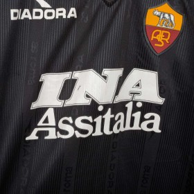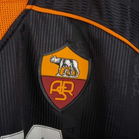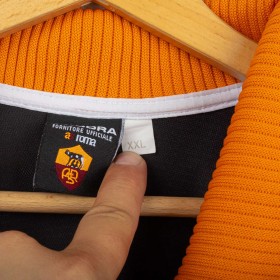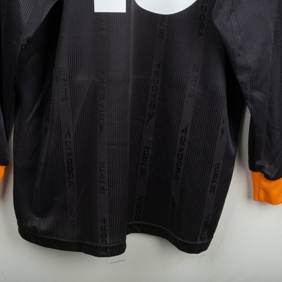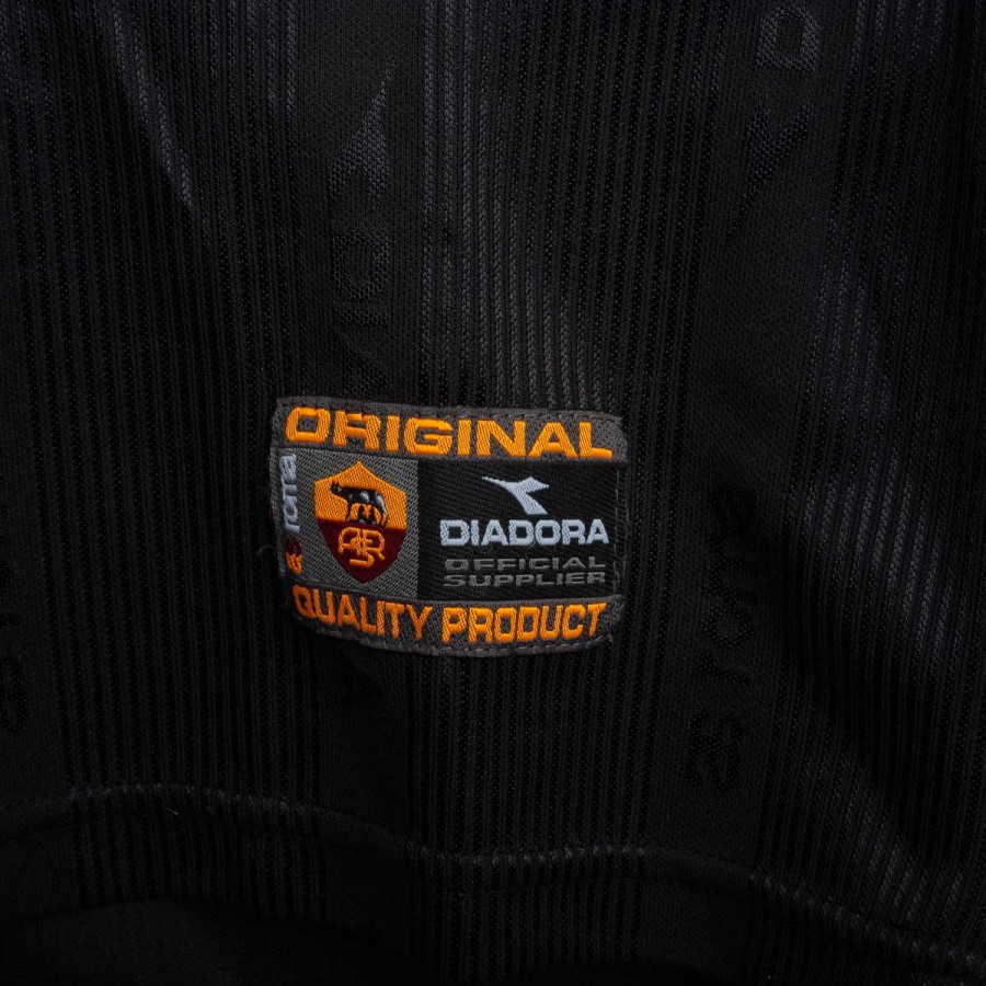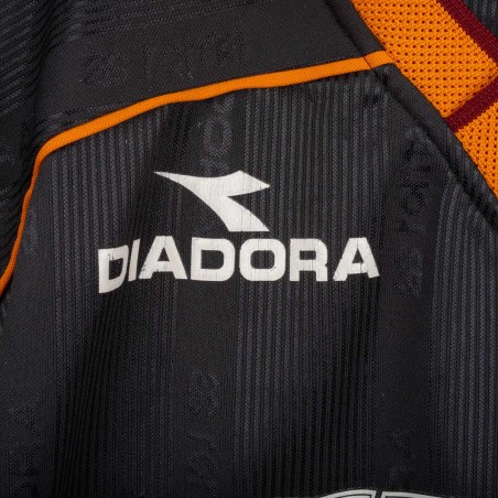 Maglia third Roma della stagione 1999/2000 realizzata da Diadora. Modello a maniche lunghe di colore nero con dettagli arancioni su colletto, polsini e cuciture. Logo Diadora bianco stampato sul petto destro e stemma AS Roma ricamato sul lato cuore. Sponsor "INA Assitalia" stampato sul fronte. Motivo jacquard tono su tono con scritta "AS Roma". Nome "TOTTI" e numero 10 applicati sul retro in bianco. Vestibilità ampia tipica dell'epoca. Taglia XXL. Prodotto ufficiale Diadora, fornitore tecnico AS Roma.