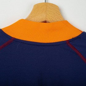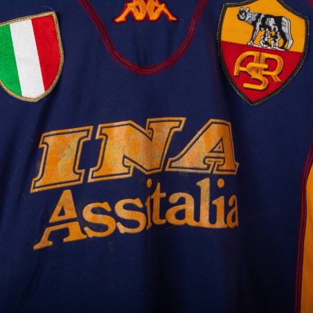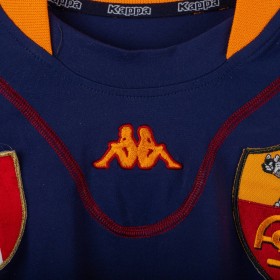 Maglia Kappa della Roma, stagione 2001/2002. Modello third di colore blu navy con inserti arancioni sui lati e cuciture a contrasto rosse. Sul petto, stemma AS Roma ricamato e logo Kappa centrale. A sinistra lo scudetto tricolore, simbolo del titolo di campioni d'Italia vinto nella stagione precedente. Sponsor tecnico Kappa e sponsor commerciale INA Assitalia stampati sul fronte. Logo Kappa ricamato anche sulle maniche. Vestibilità attillata tipica dei modelli Kappa di inizio anni 2000. Utilizzata in Serie A e Champions League. Taglia L.