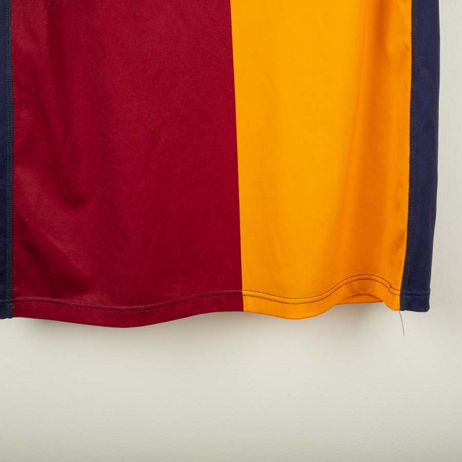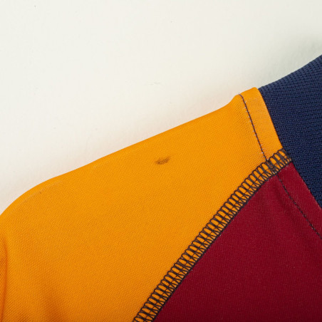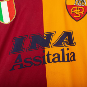 Maglia ufficiale della Roma stagione 2001/2002, prodotta da Kappa e personalizzata con nome e numero Panucci 14. Design a metà giallo e metà rosso, con dettagli blu navy e stemma Scudetto al petto, simbolo del titolo vinto l'anno precedente. Presenta sponsor INA Assitalia e logo Kappa sulle maniche. Realizzata in tessuto tecnico elastico per garantire comfort e vestibilità perfetta.