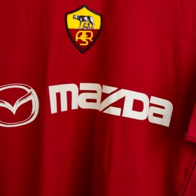 Maglia Home ufficiale della Roma per la stagione 2004/2005, prodotta dallo sponsor tecnico Diadora. La maglia è caratterizzata dal classico colore giallorosso, con dettagli dinamici e un design moderno per l'epoca. Sul petto sono presenti lo stemma della Roma sul lato cuore e il logo dello sponsor commerciale Mazda al centro. Il nome "Cassano" e il numero 18 sono applicati sul retro. Questo modello, di taglia L, è un pezzo ricercato dai tifosi e collezionisti.