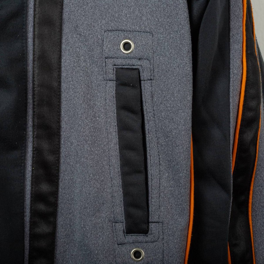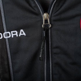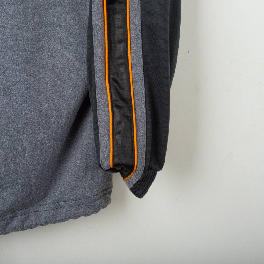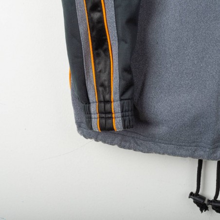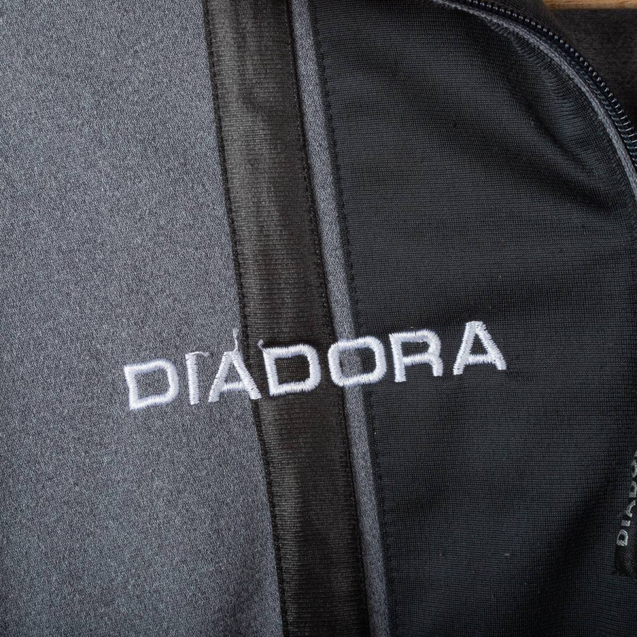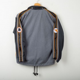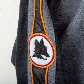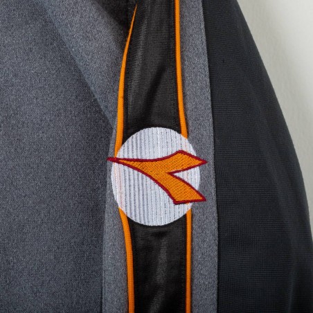 Giacca ufficiale AS Roma della stagione 1997/1998, realizzata da Diadora per il settore giovanile. Il capo presenta il logo Diadora e lo stemma AS Roma ben visibili sul petto, con inserti neri e grigi impreziositi da dettagli arancioni. Sulle maniche sono presenti i loghi Diadora e il celebre lupetto simbolo del club. Taglia bambino 38. Un dettaglio interessante è il colletto interno color arancione che richiama i toni storici del club.