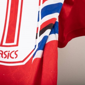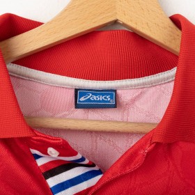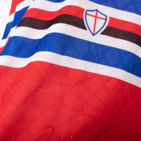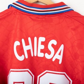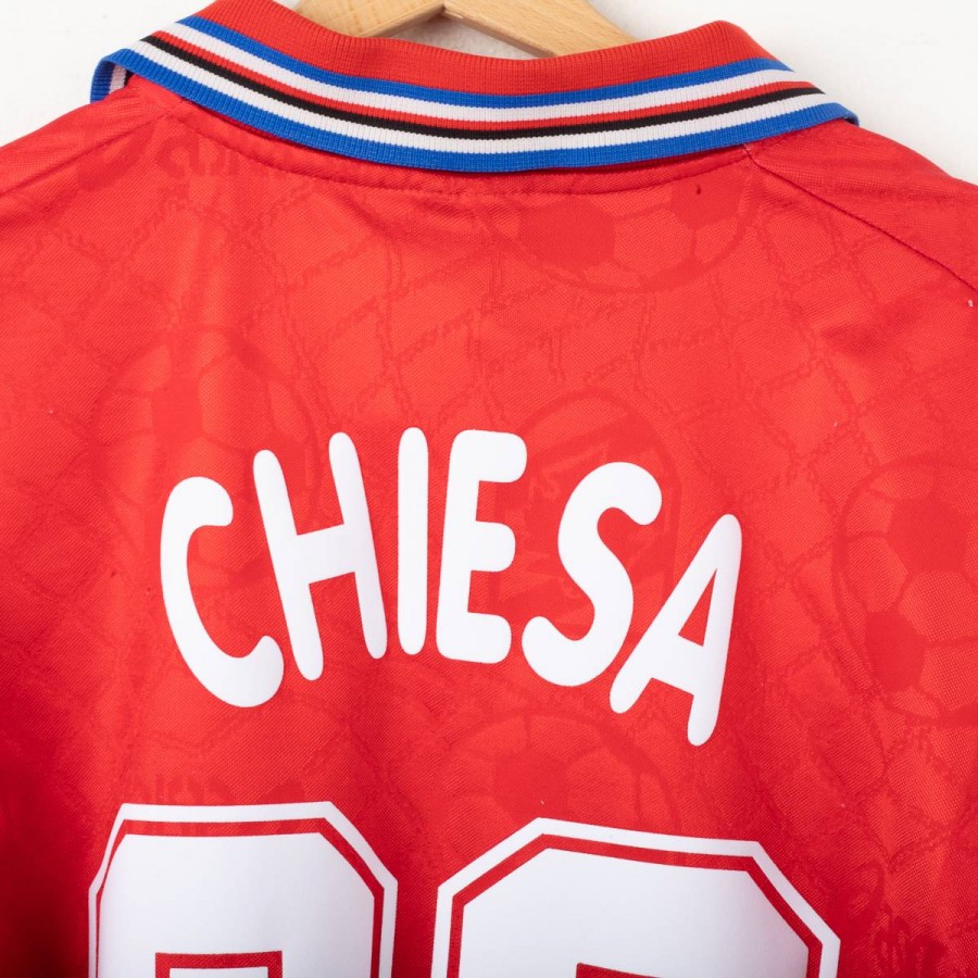 Maglia Third Sampdoria Asics Chiesa 20 1995/1996. Prodotta da Asics, questa maglia si presenta con l'iconica banda blucerchiata centrale su fondo rosso, colletto a polo con righe tricolori e chiusura con bottone. Trama geometrica tono su tono e dettagli curati rendono questo modello uno dei più apprezzati degli anni '90. Presenta lo sponsor tecnico Asics e lo sponsor commerciale Nuova Tirrena. Sul retro sono riportati il nome Chiesa e il numero 20. La taglia indicata è M.